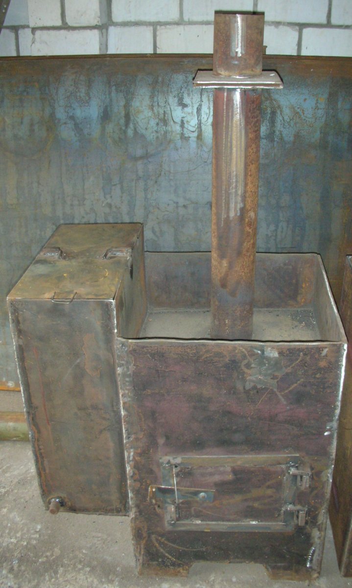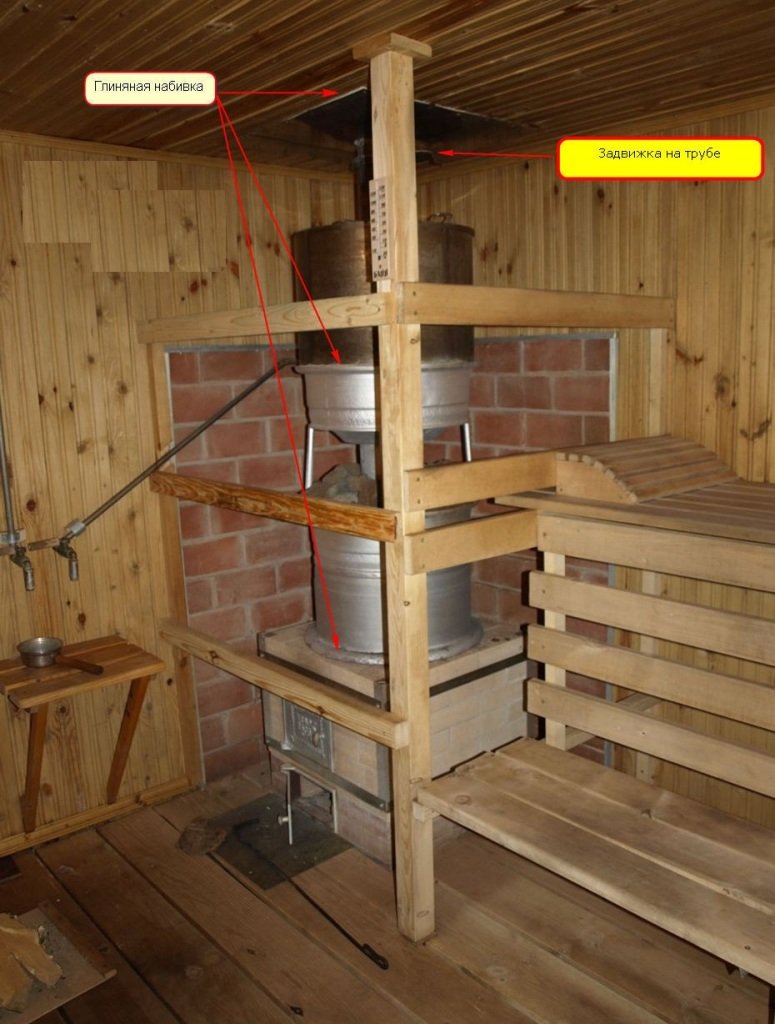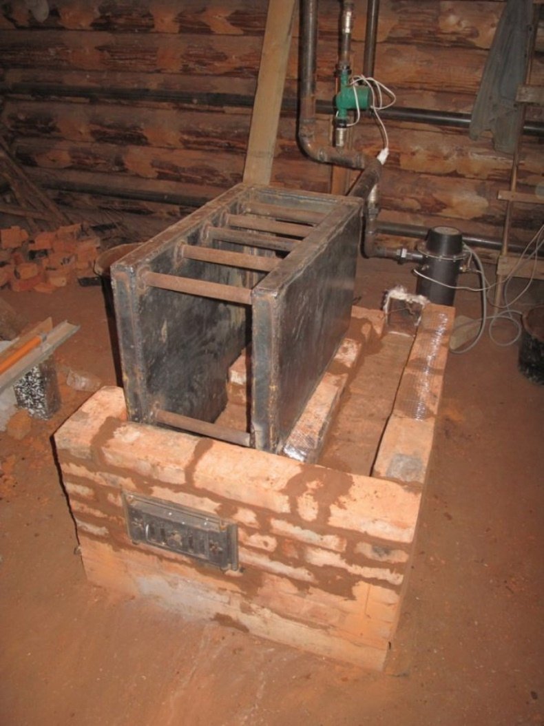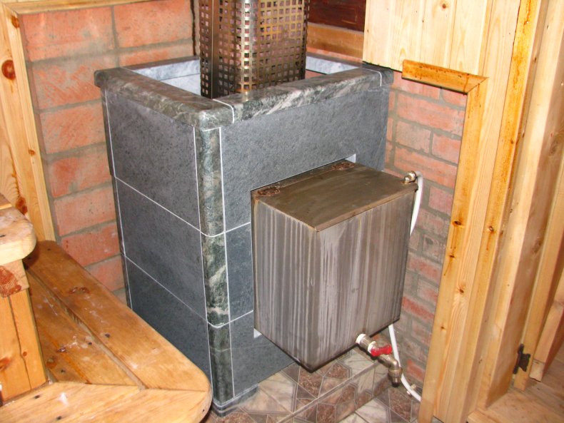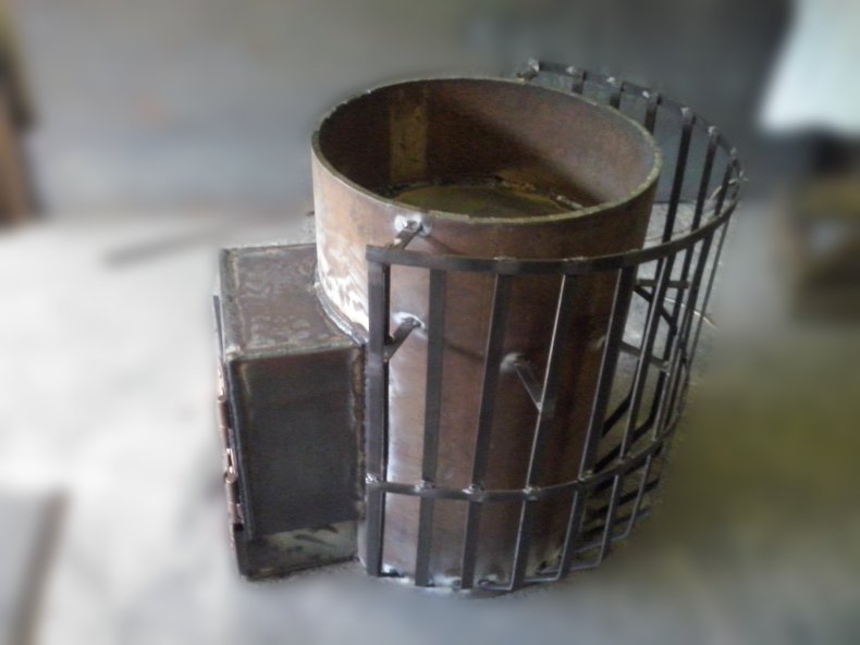 - Он будет работать регулятором тяги. Наверху сооружения нужно будет приварить емкость для камней. И конечно же сбоку поставить бак для нагрева воды.