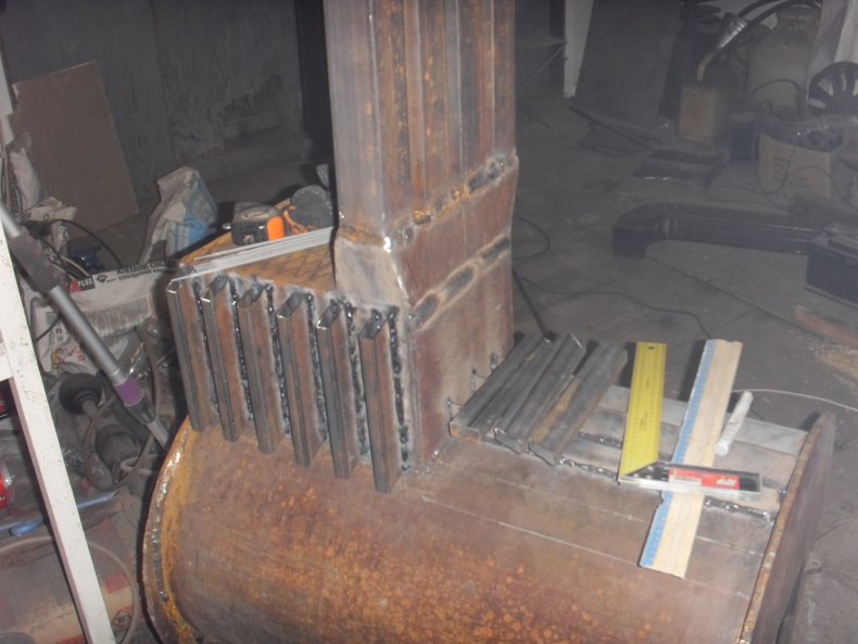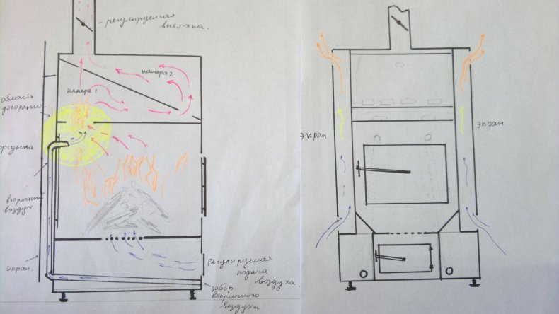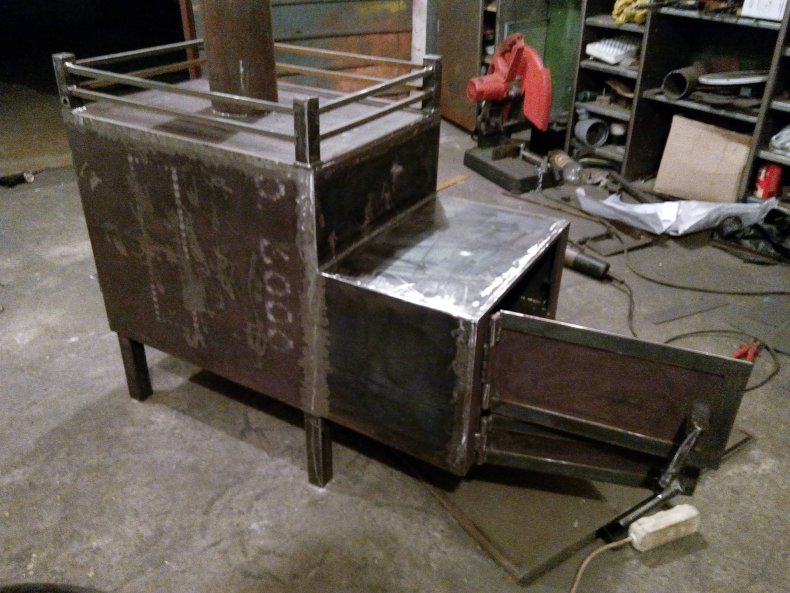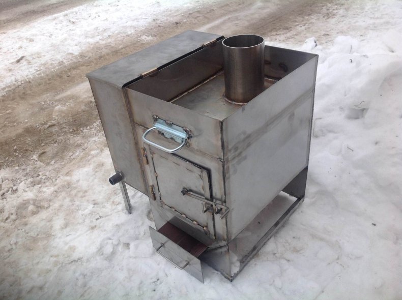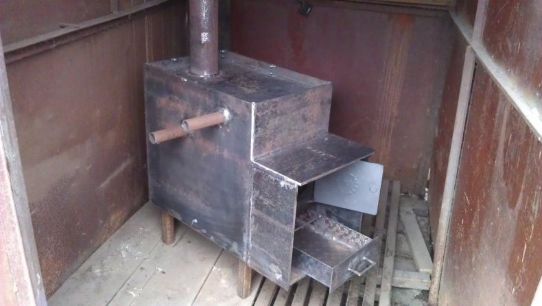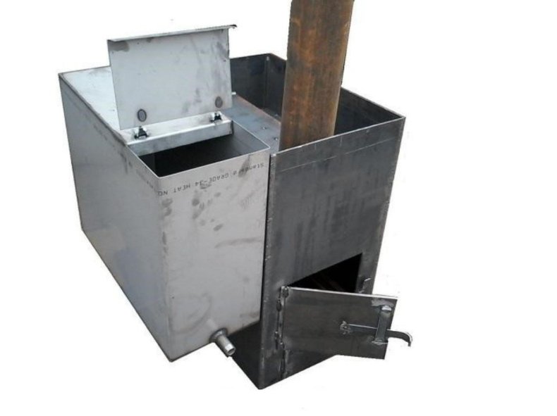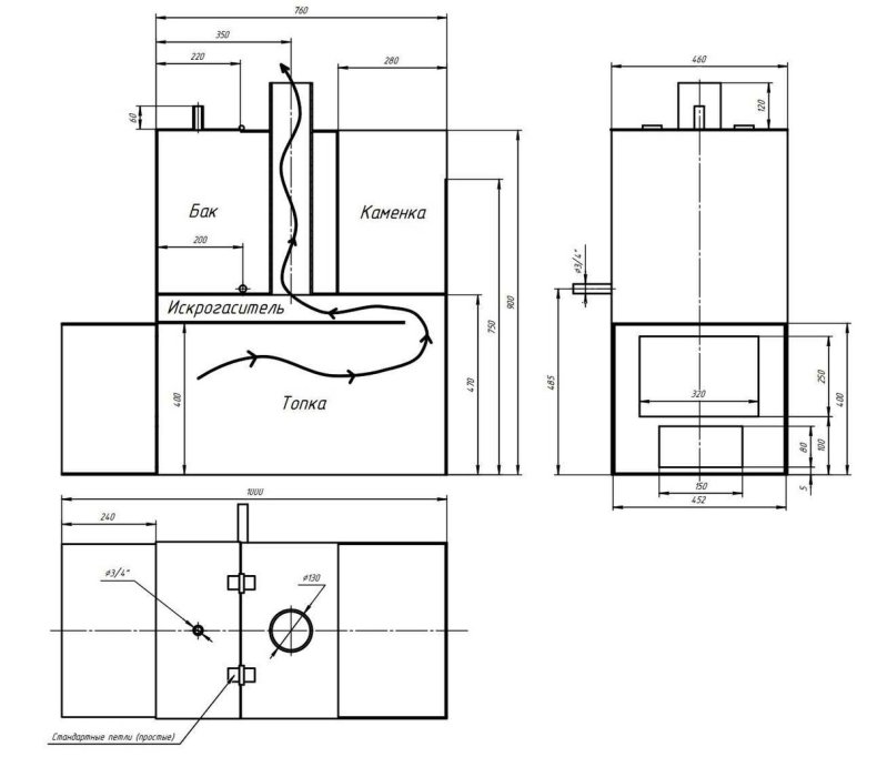 - Он будет работать регулятором тяги. Наверху сооружения нужно будет приварить емкость для камней. И конечно же сбоку поставить бак для нагрева воды.