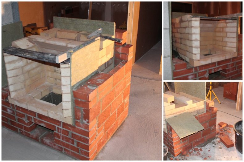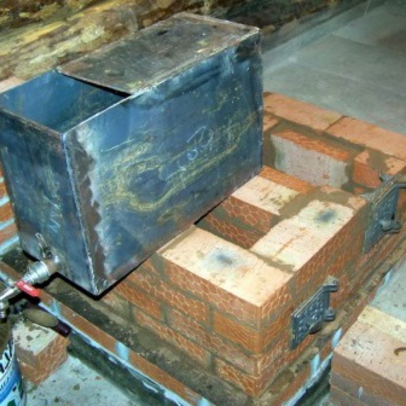 - Затем поставить резервуар для воды, дальше на него разместить люк топки. Люк и емкость для воды отгородить асбестом. Асбестовые листы предохраняют от перегрева. Следующие три ряда кирпичей обкладывают люк и емкость для воды.