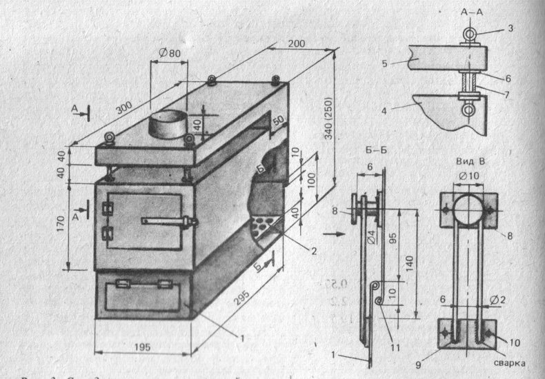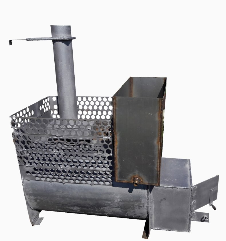 - Лоток размерами 350мм-250мм-150мм приваривается под колосник. В отверстие в торце устанавливают совок для золы.