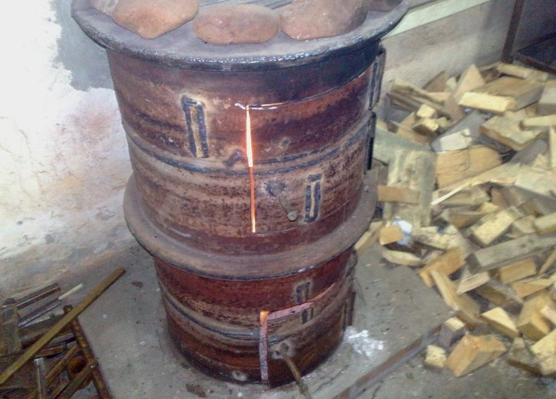 - Туда вставляется труба и приваривается. Торцы бочки закрываются листами, которые сверху вырезаются в форме полукруга, а нижняя часть оставляется такой же, чтобы быть подставкой.