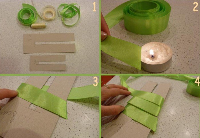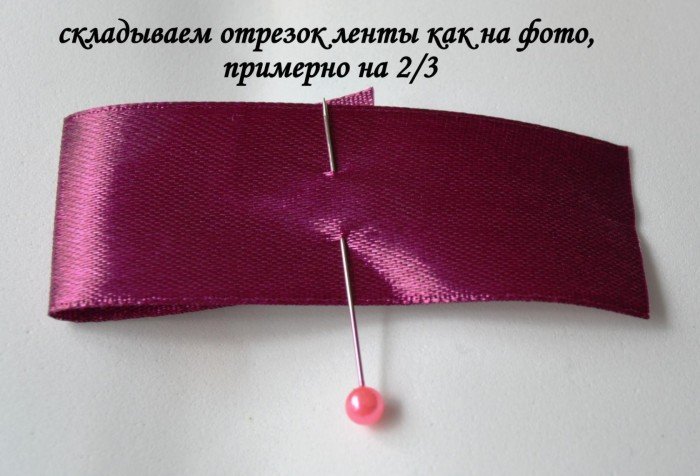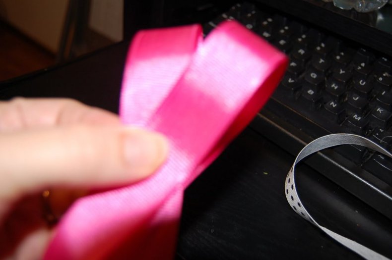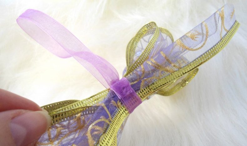 - Мы можем оставить лук в этом состоянии или придать ему (назовем его) более изящный характер. Для этого подготавливаем небольшой кусок нашей ткани (фетр / ленту) и поместите его в середину банта.