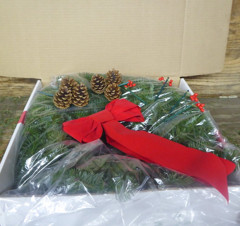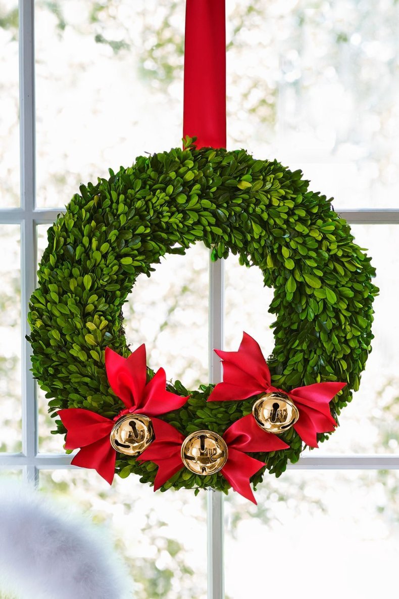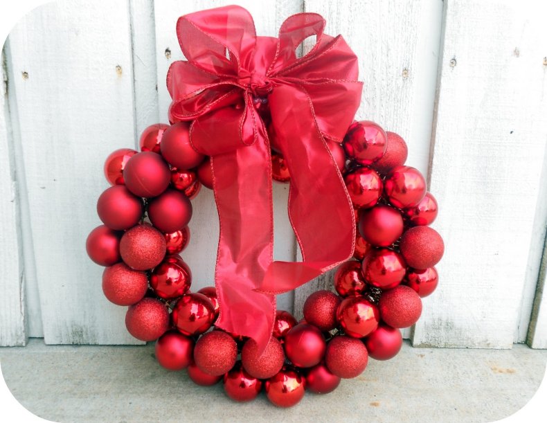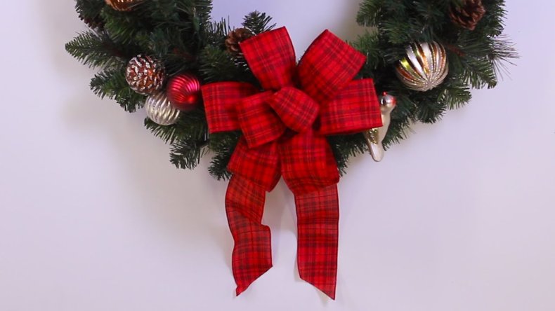 Наконец, соедините оба конца проволоки вместе и прижмите плоскогубцами. Разверните бантики, чтобы закрыть швы, и прикрепите декоративную ленту. Вы можете привязать его к проволоке или обернуть вокруг венка. Готовый орнамент повесьте на елку. Сделайте несколько одинаковых венков, но используя разные струны.