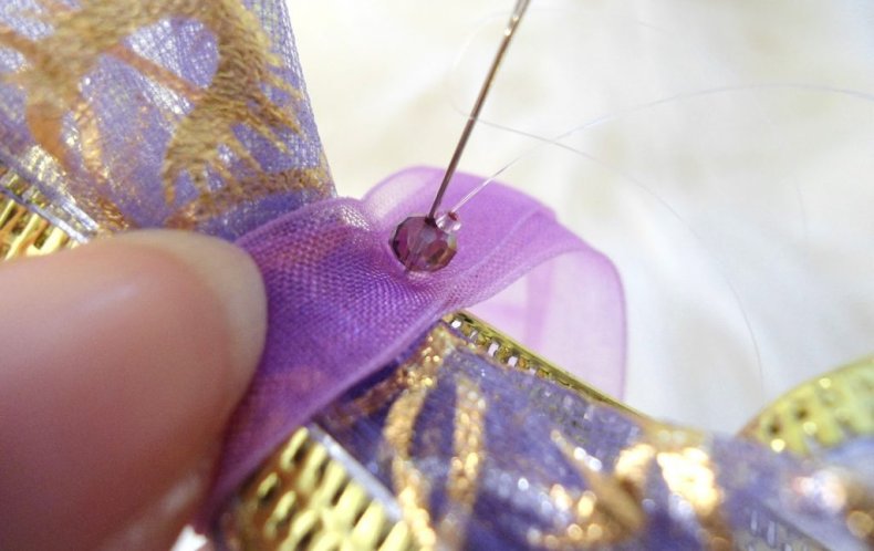 - Натянуть на проволоку сделанные ранее бантики. Разложите их в разные стороны, чтобы украшение получилось максимально пушистым. Чем больше вы натягиваете тетивы, тем более плотным и однородным будет венок без пустот.