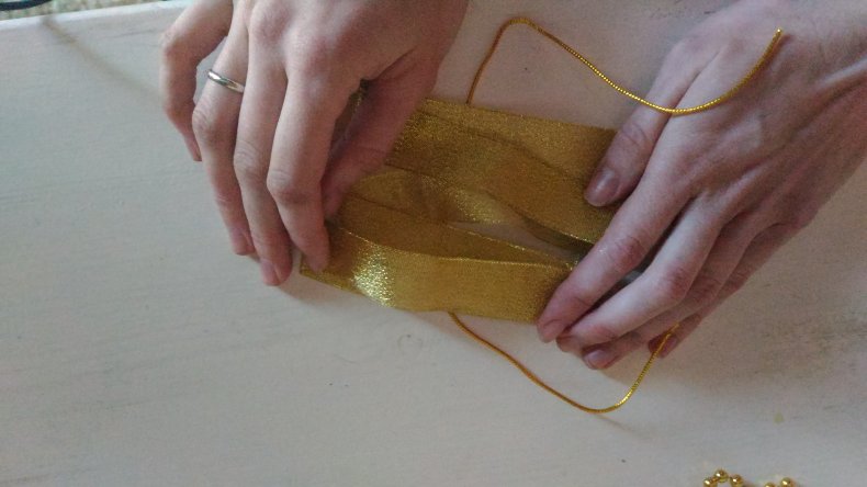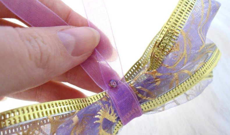 - Готовим меньший кусок фетра/ленты. Кладем его в середину дужки переворачиваем и соединяете оба конца иглой и ниткой.