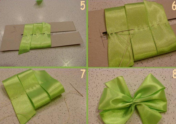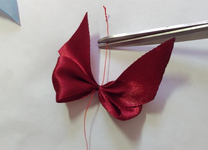 - Надо все «мять». Так что берем фетр, как показано на фото выше. Готовим крученую / обычную нить и завязываем им свой бант. Не забывая завязать двойной узел на конце и отрезать выступающие концы.