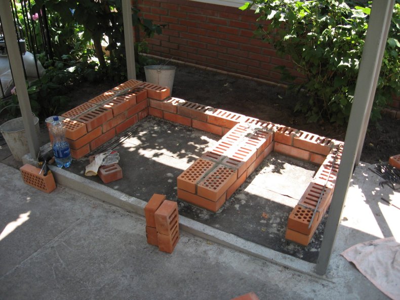 Выкладывают нижний слой, который должен быть монтирован ровно. Можно залить всё цементом, если не будет возникать желания в дальнейшем перенести мангал. Цемент стоит использовать хороший, чтобы конструкция служила длительное время, не теряла свои качества.