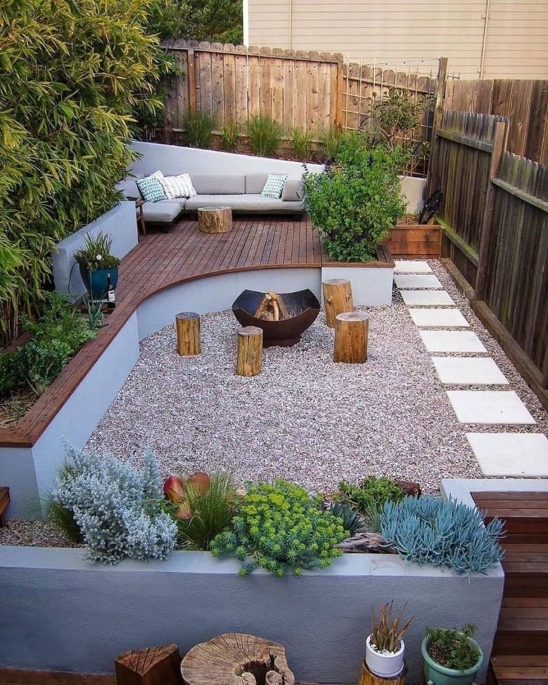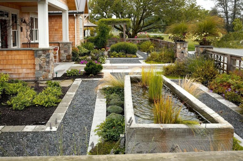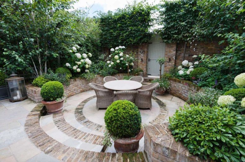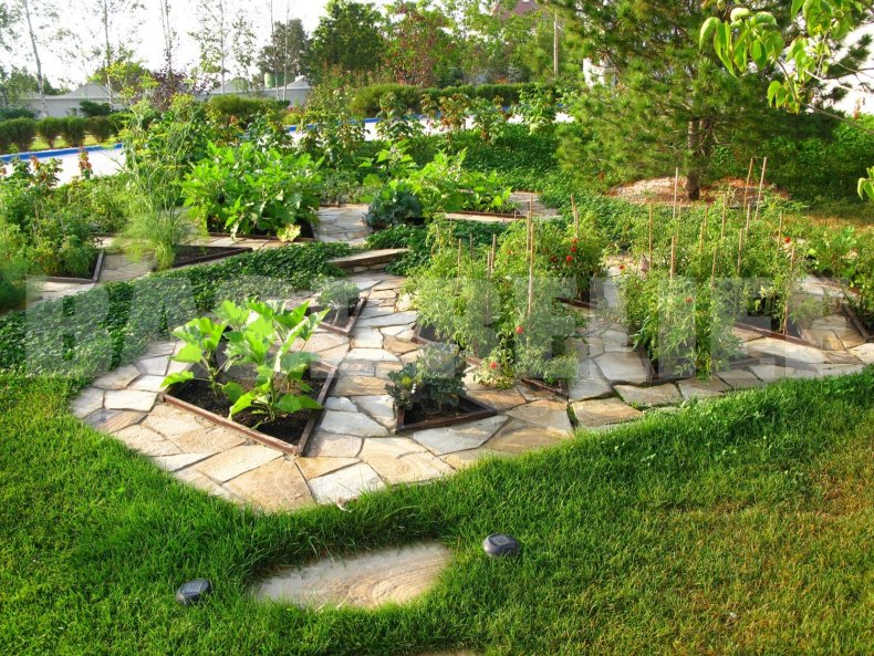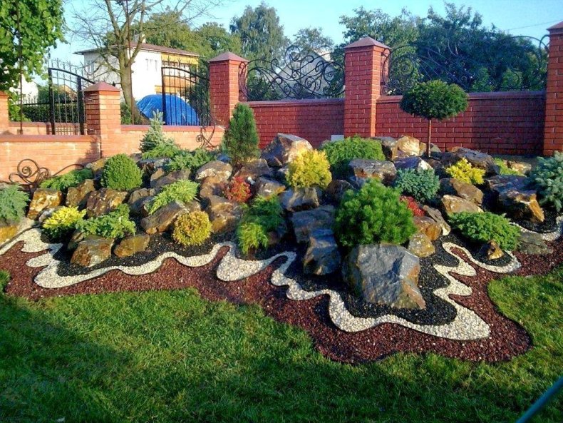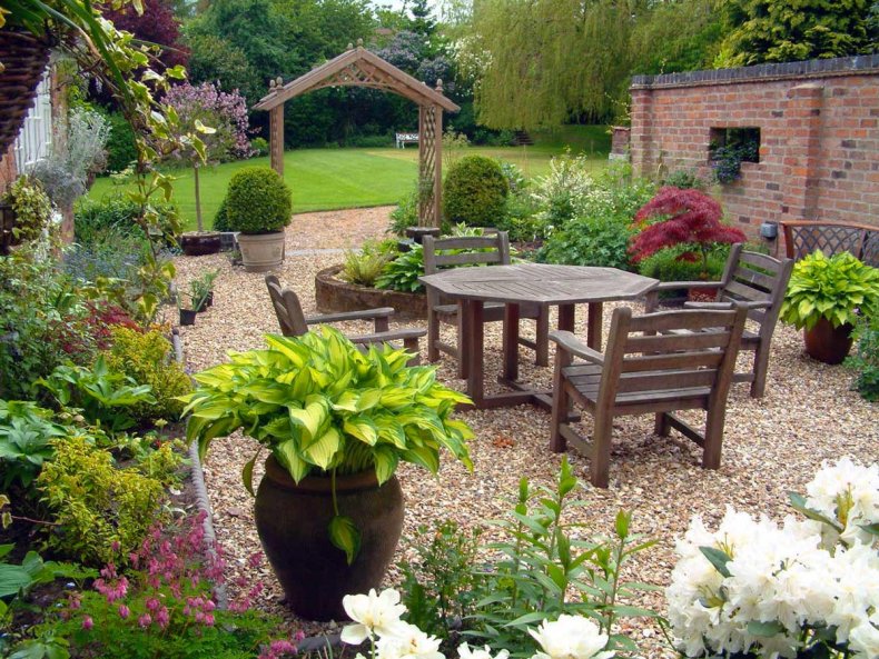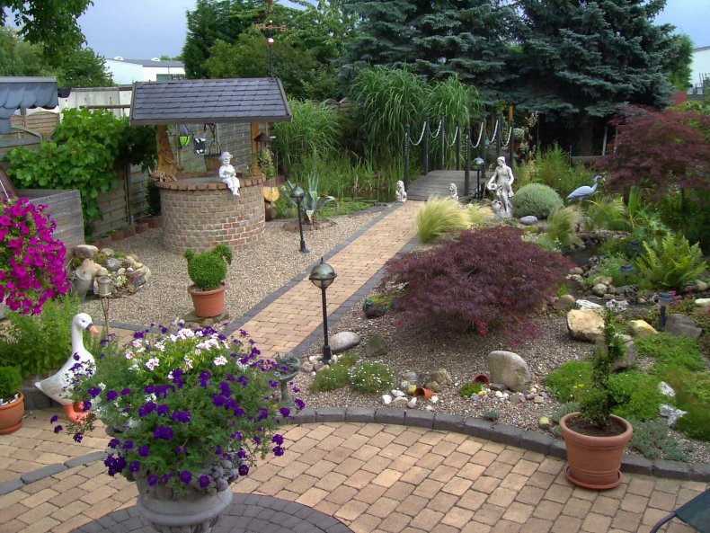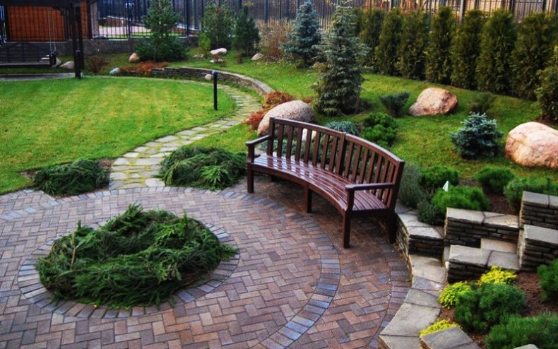 В основе садового участка лежит гравий, к нему можно добавить брусчатку или дерево, также можно сделать дорожки из мозаики.