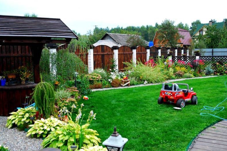 - А если у вас есть дети, то стоит порадовать их детской площадкой: горкой, песочницей, качелью.