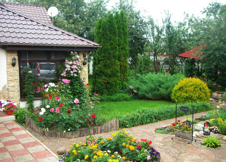 - При входе в калитку дома следует с двух сторон посадить вьюнок или маленькие цветочки. Сделать аккуратную грядку, можно в виде маленького заборчика, и покрасить этот заборчик в яркую краску, можно сочетать краски с домом, чтобы смотрелась гармонично.
