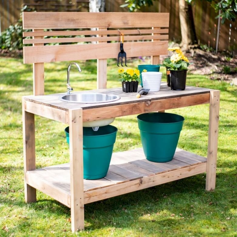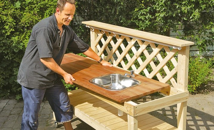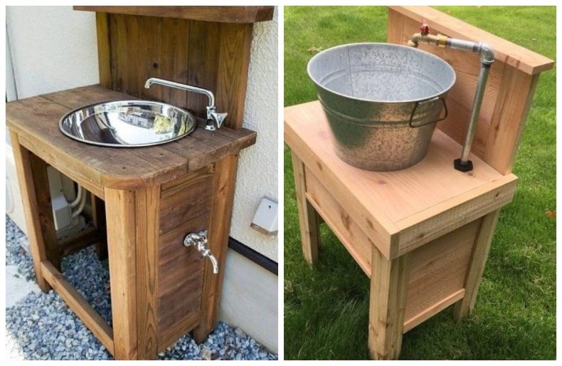 Подойдут для использования в помещении и на улице. Состоит из деревянной тумбы, мойки и хранилища для воды.
