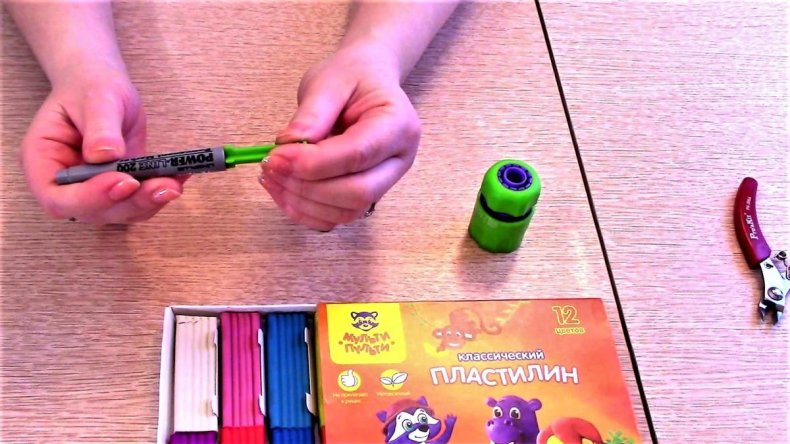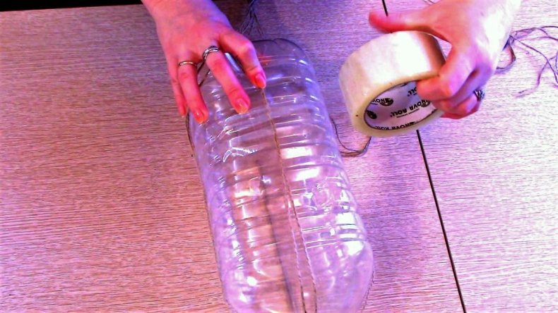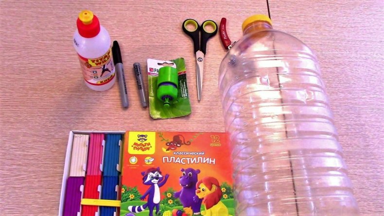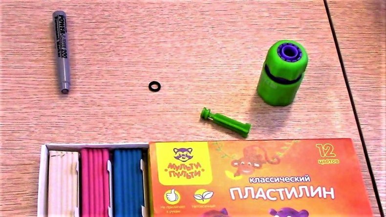 Понадобится пятилитровая бутылка из пластика, ненужный маркер, ножницы, водостойкий клей, соединитель для шлангов и пластилин.