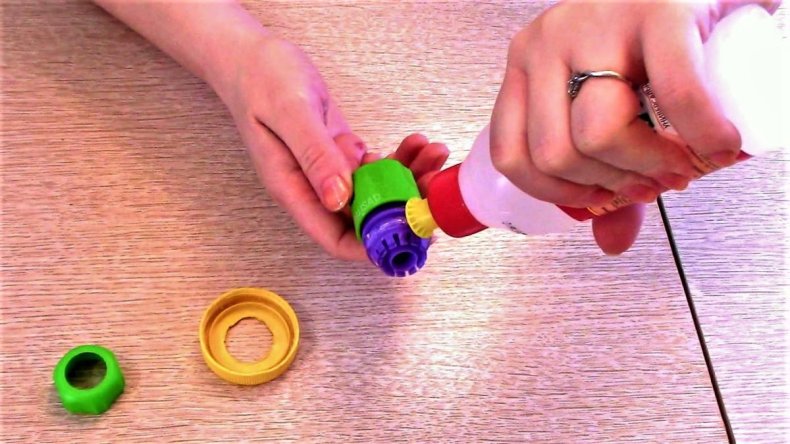 - Снять крышку бутылки. Вырезать отверстие в крышке такого же диаметра, что и в резьбе на соединителе, и установить соединитель в крышке. Затем резьбу необходимо предварительно смазать клеем и прикрепить к крышке. Должно получиться так, чтобы резьба оказалась внутри крышки.