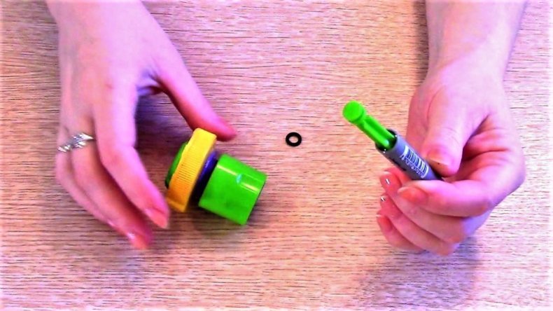 - Сначала нужно немного поработать с соединителем шлангов. Его клапан необходимо утяжелить. Для этого необходимо раскрутить маркер на части, и оставить только корпус. Потом вытащить клапан соединителя и снять с него уплотнитель.