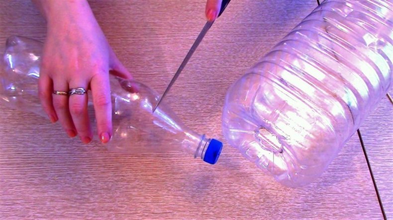 - Срезать горлышко у бутылки из пластика и соединить с канистрой в том месте, в котором планируется кран, затем обвести это место маркером.