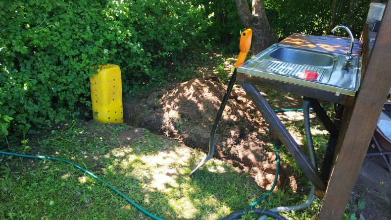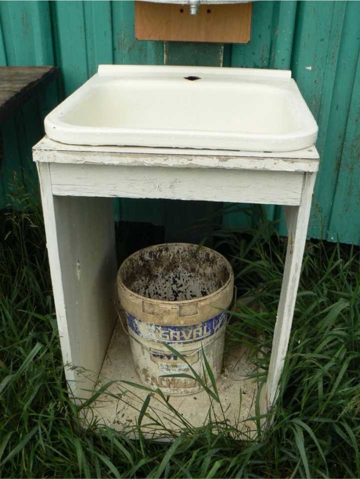 В качестве слива подойдет раковина с обычным ведром. Также вода может стекать прямо на почву, заранее присыпанную щебнем.