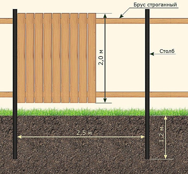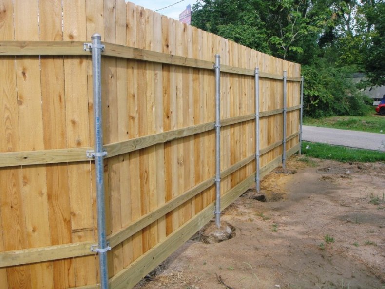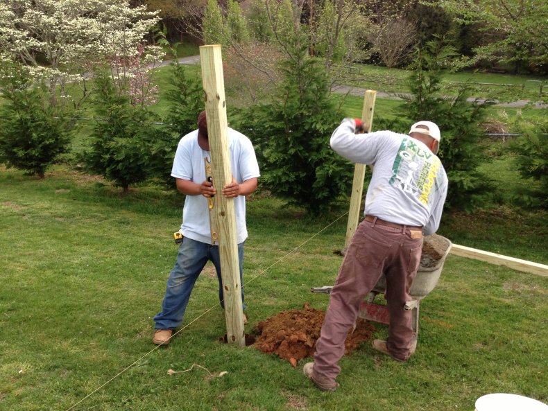 Первым шагом в строительстве забора является установка столбов на концах и углах забора. Важно, чтобы столбы были достаточно глубокими: минимальная глубина для забора высотой 6 футов составляет 32 дюйма.