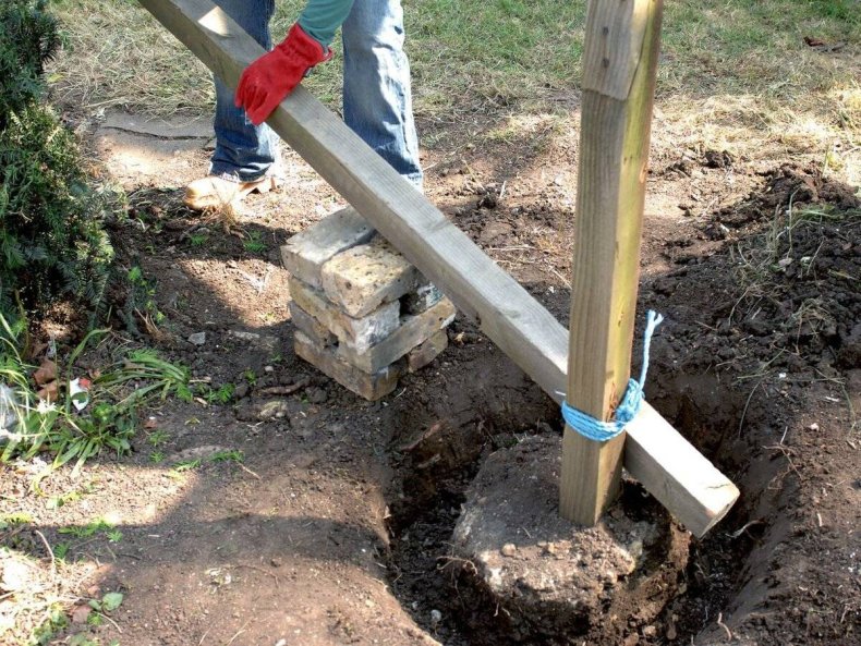 - Утрамбовывайте по дюйму или два за раз, равномерно распределяя грязь вокруг столба и используя уровень для проверки отвеса.