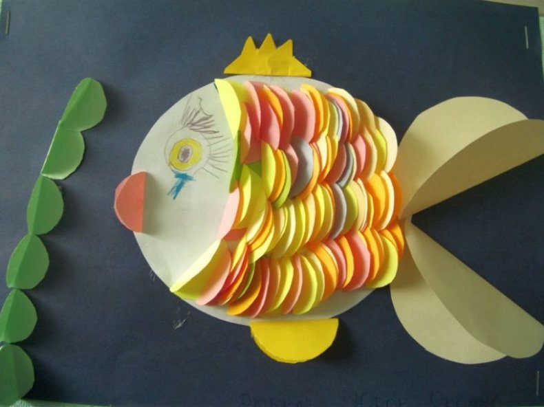 - Разломайте спичку пополам и приклейте компактную бумажную рыбку любого цвета. Пока эту деталь откладываем в сторону.