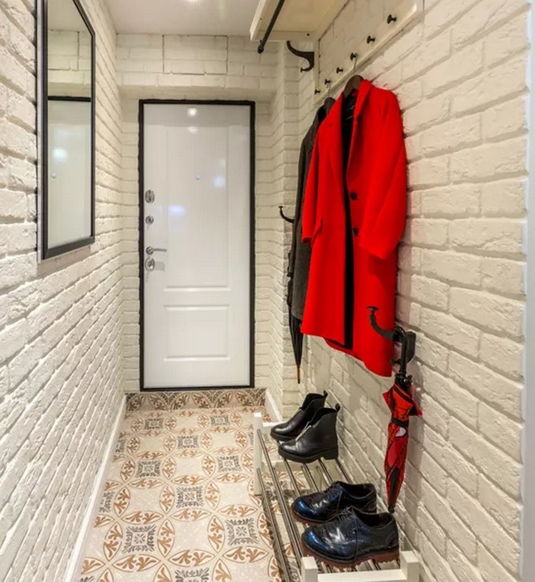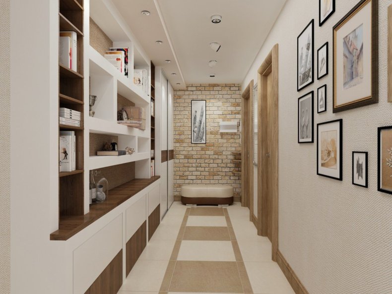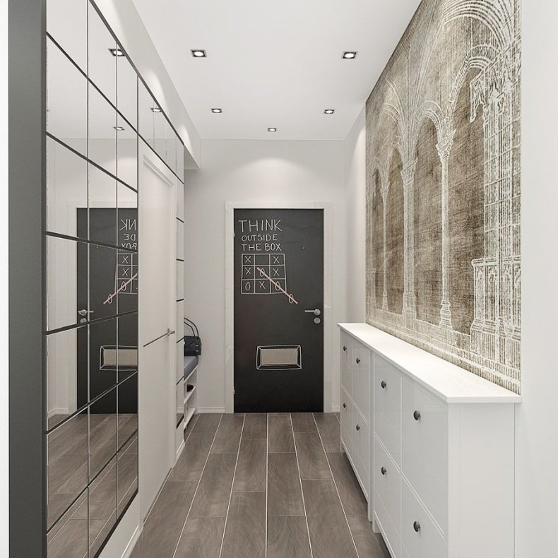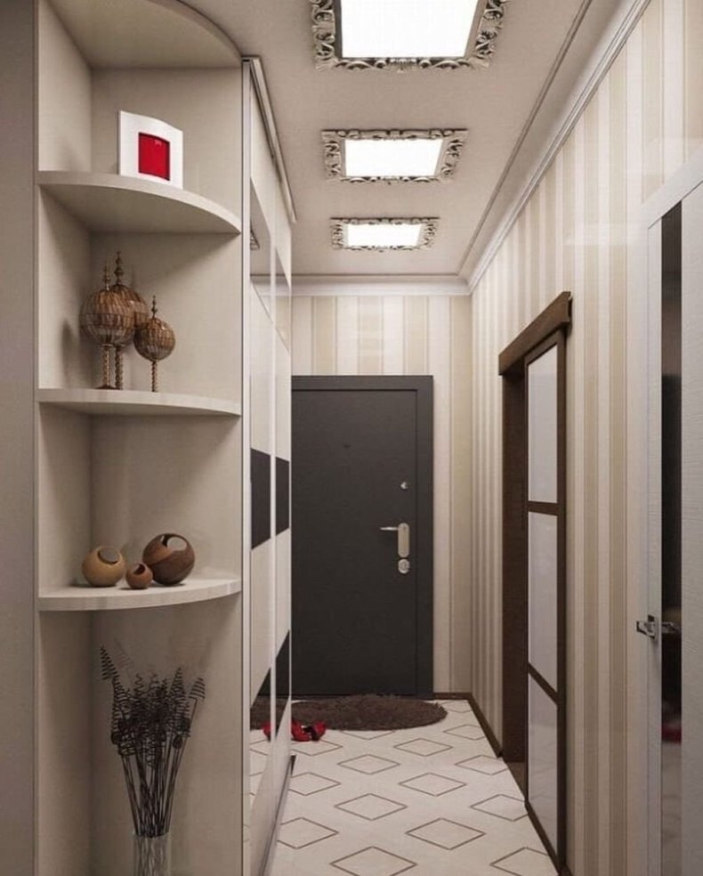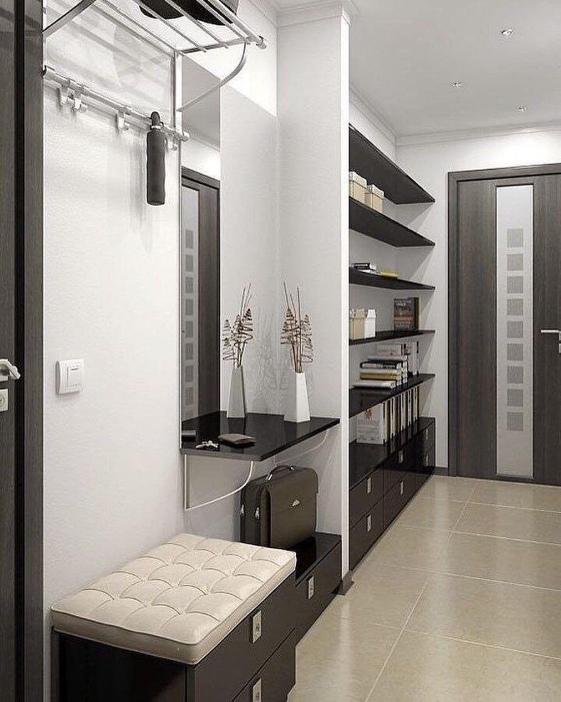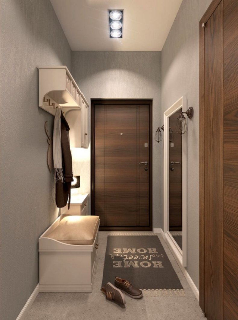 - В узком коридоре в форме прямоугольника вы не сможете сделать так же, так что придется продумать, как и где вы будете хранить вещи, самостоятельно, руководствуясь имеющимися размерами помещения.