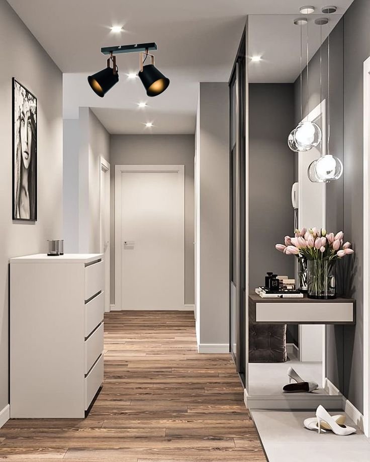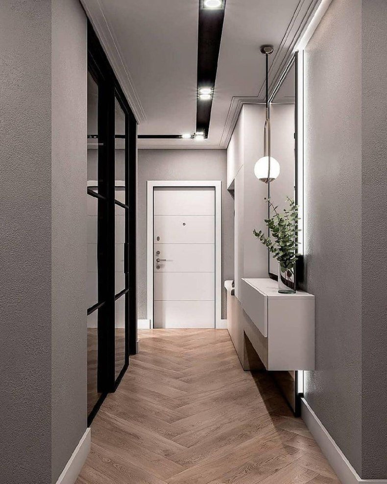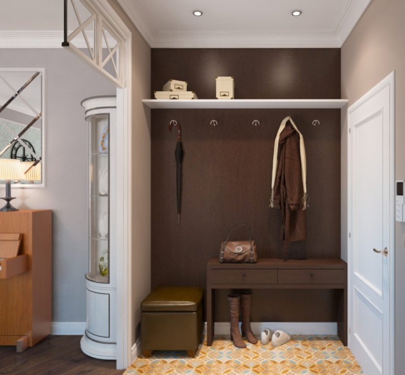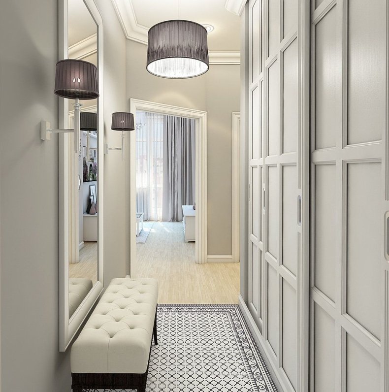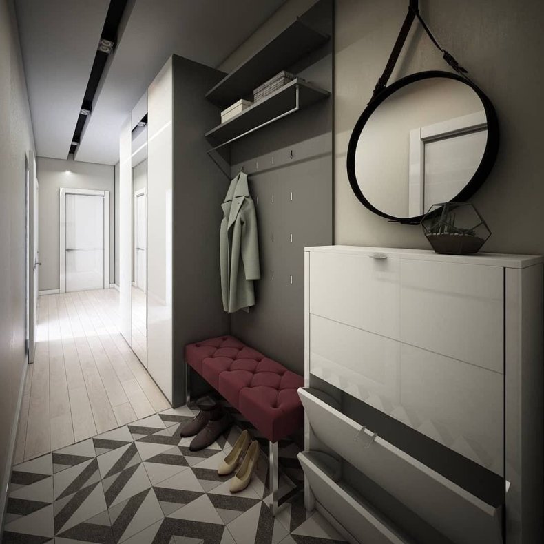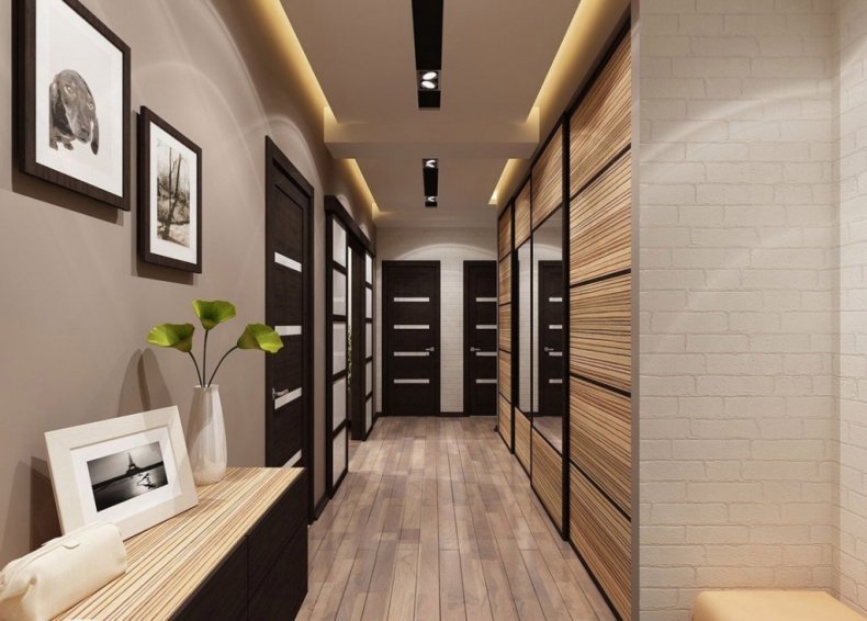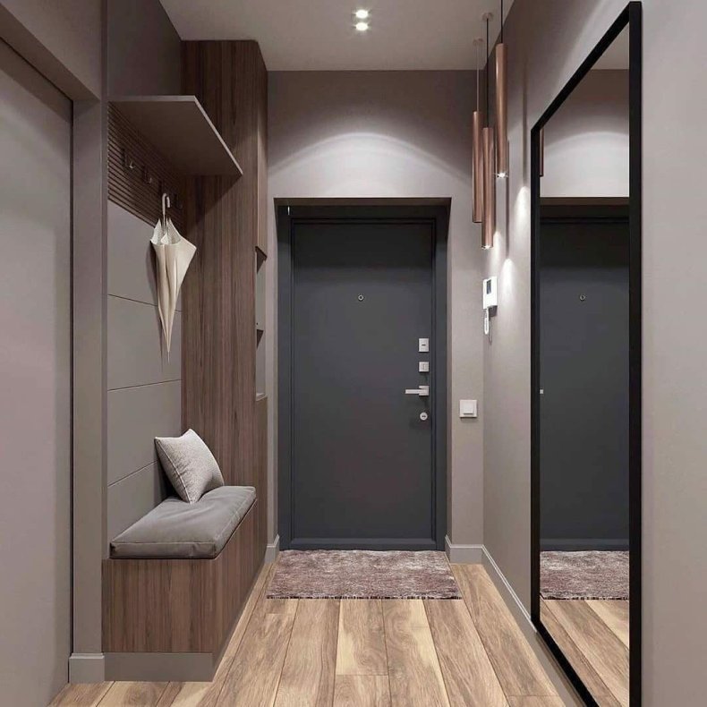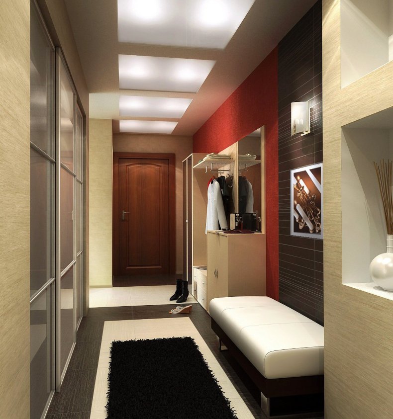 - В узком коридоре в форме прямоугольника вы не сможете сделать так же, так что придется продумать, как и где вы будете хранить вещи, самостоятельно, руководствуясь имеющимися размерами помещения.