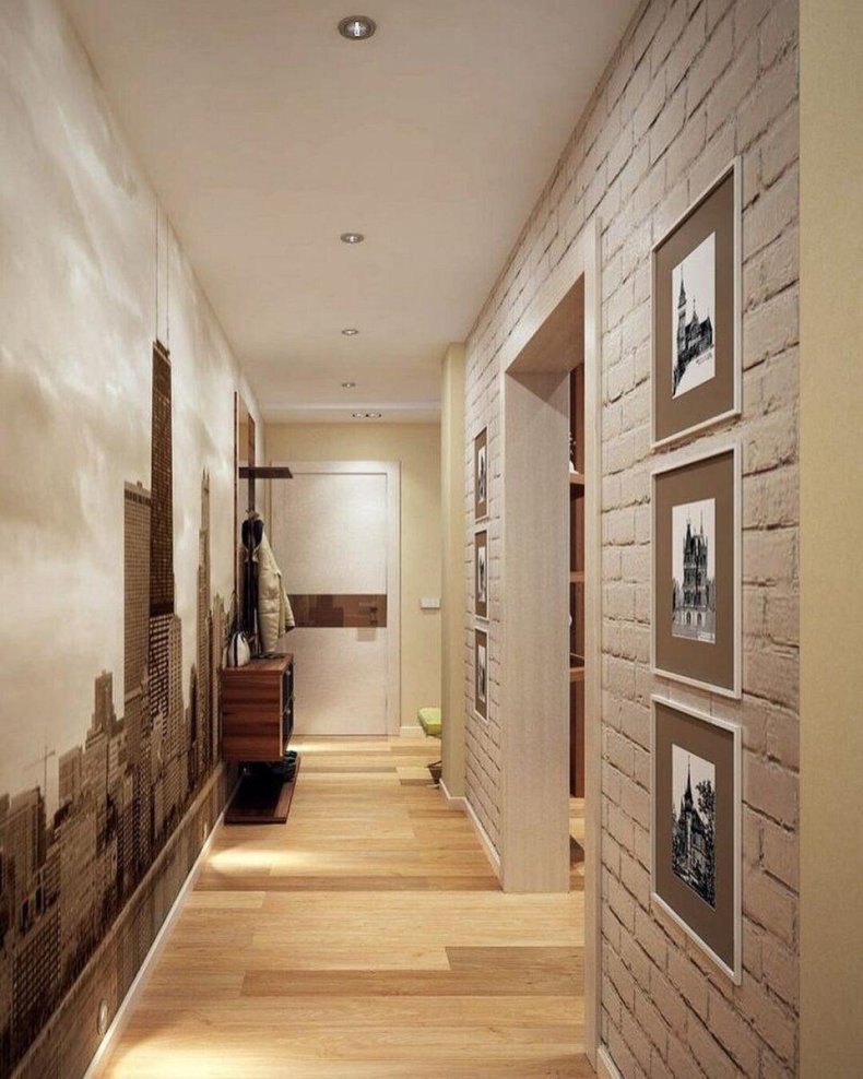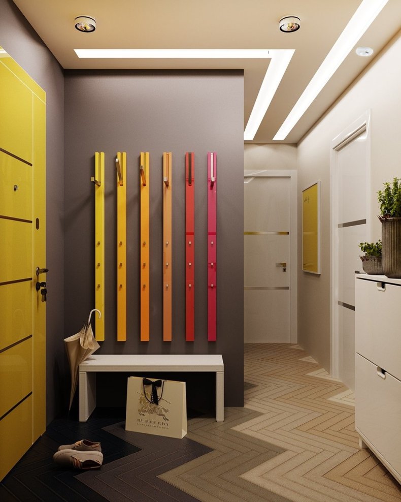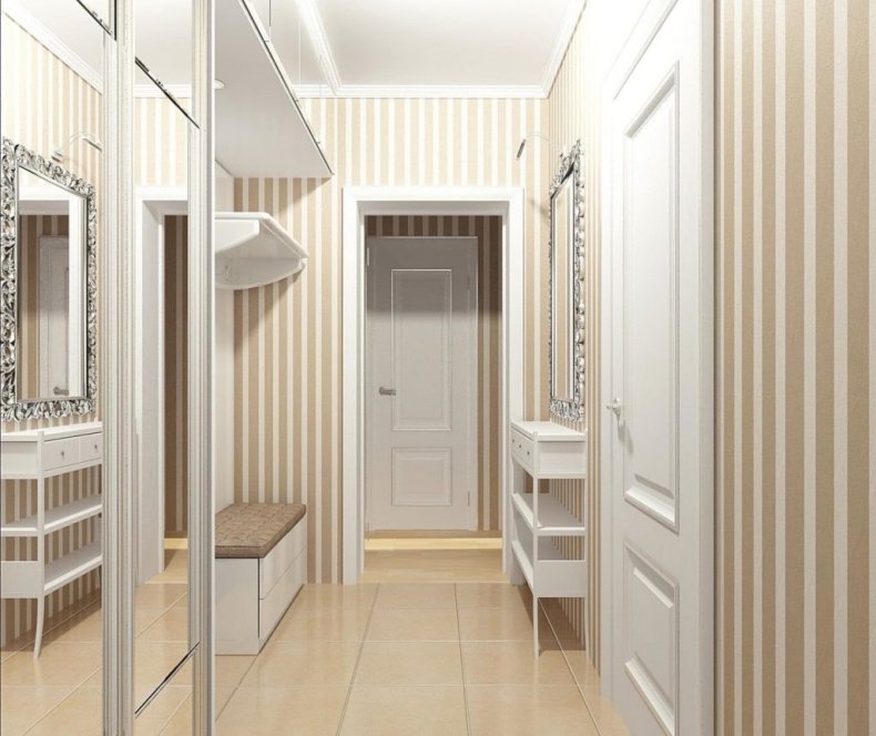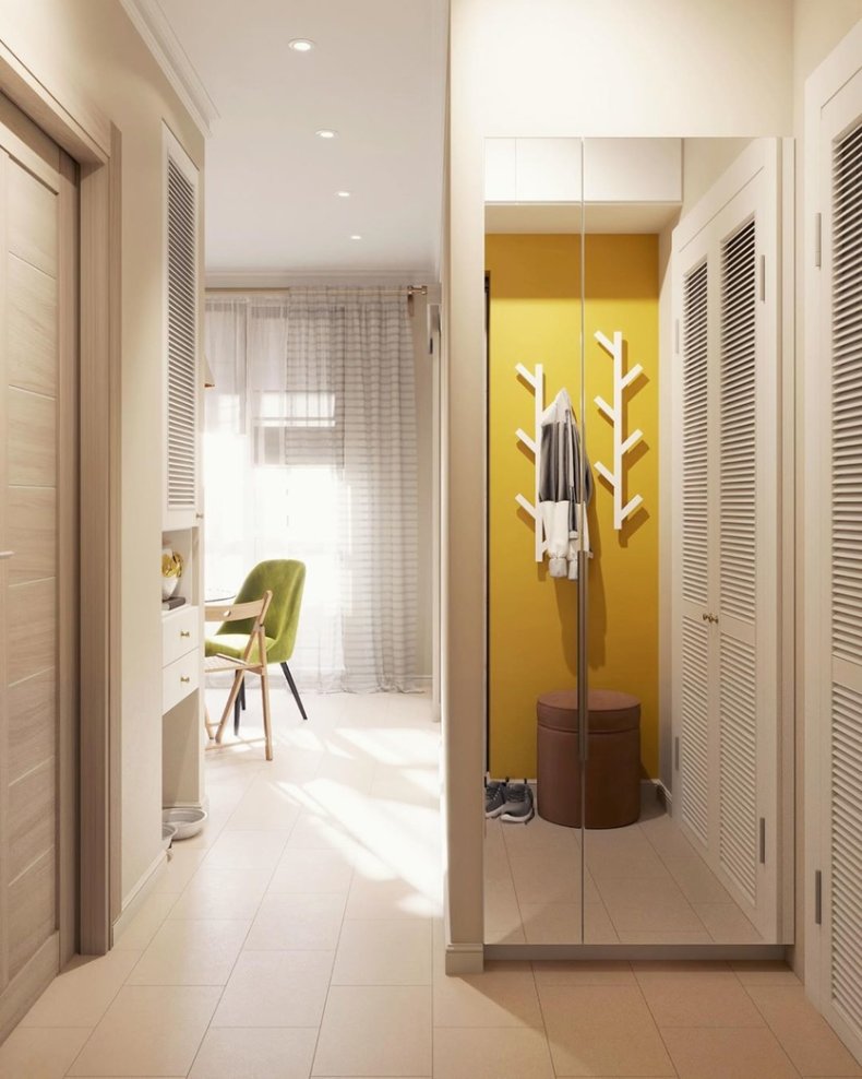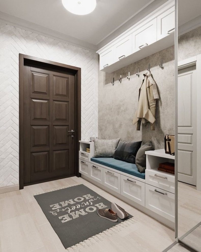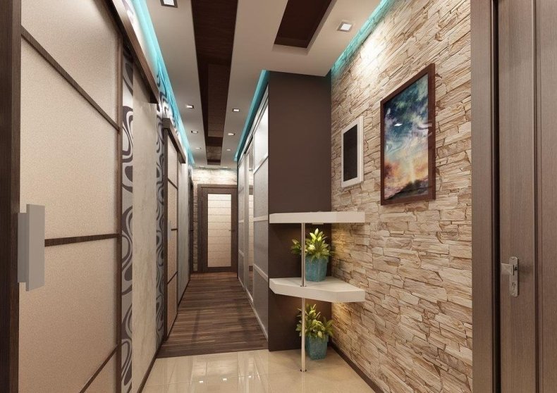 - В узком коридоре в форме прямоугольника вы не сможете сделать так же, так что придется продумать, как и где вы будете хранить вещи, самостоятельно, руководствуясь имеющимися размерами помещения.