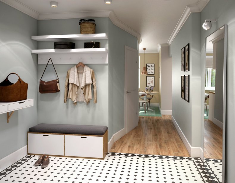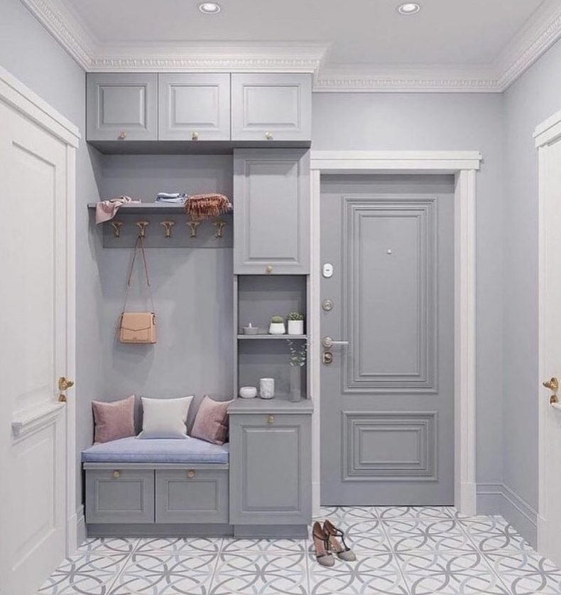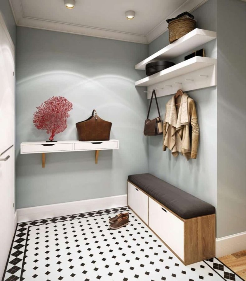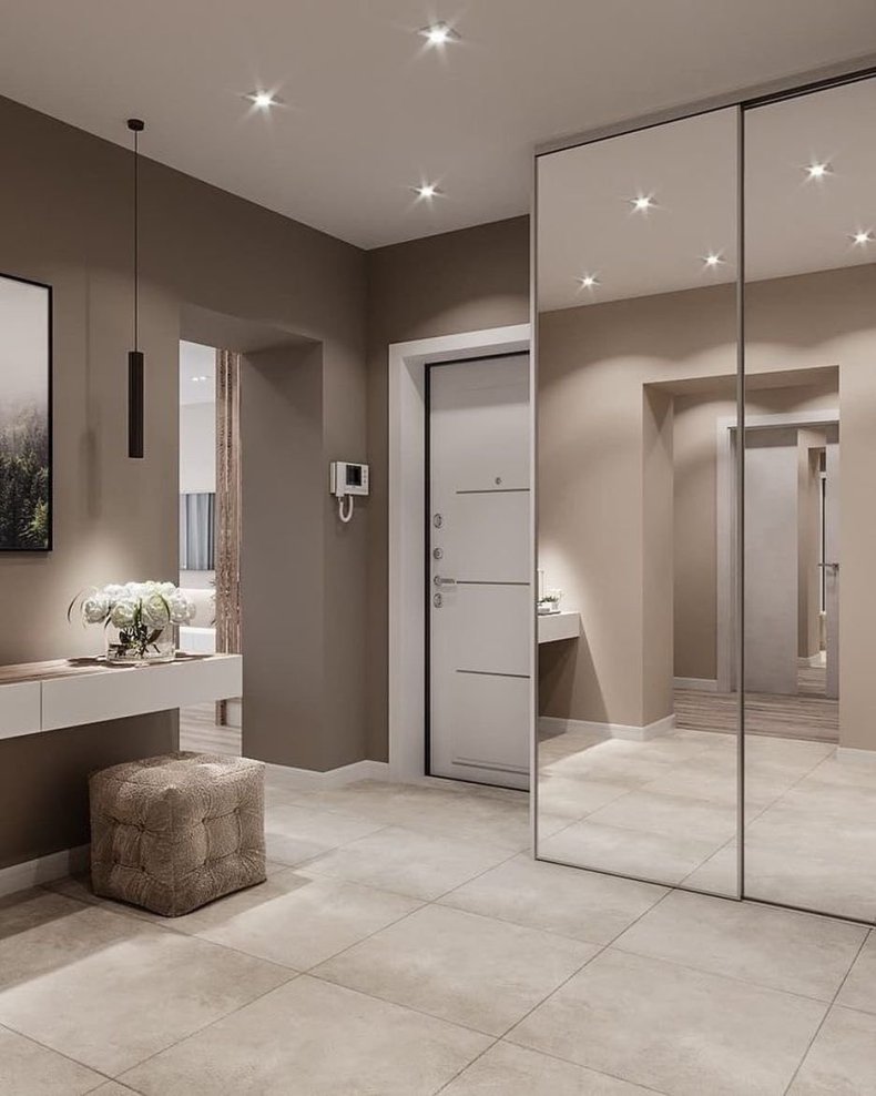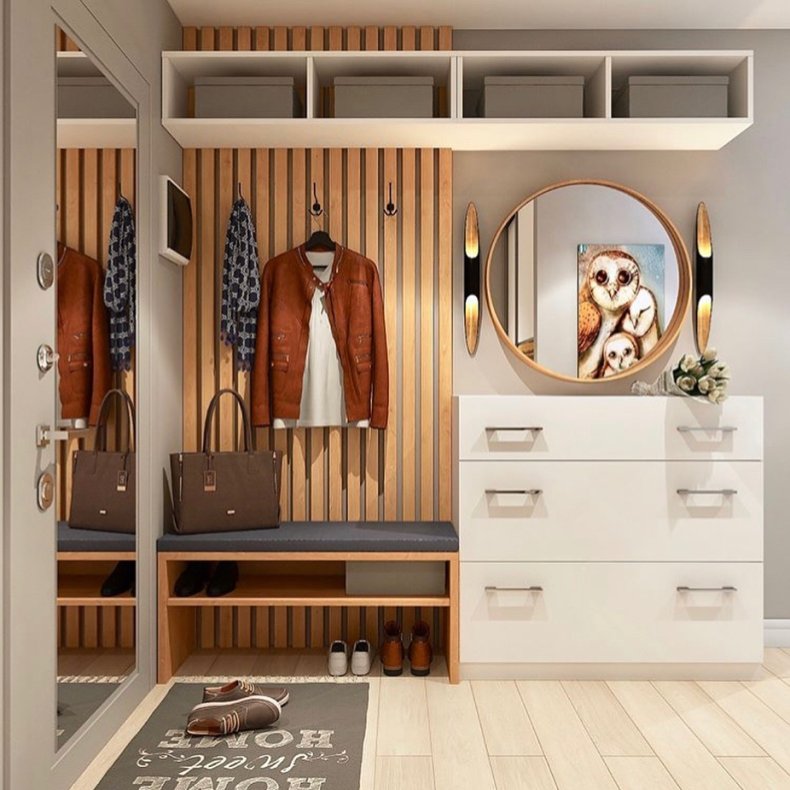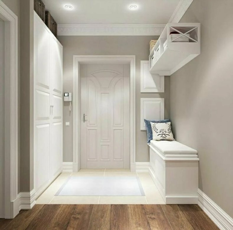 Если площади прихожей будет достаточно, установите здесь шкаф-купе, небольшой комод, а также полочки на стенах.