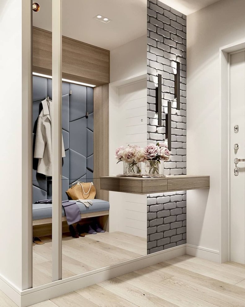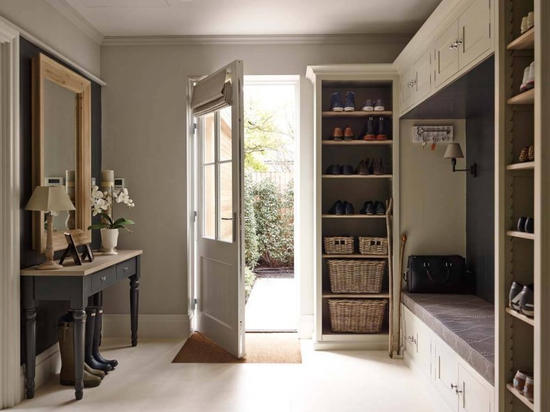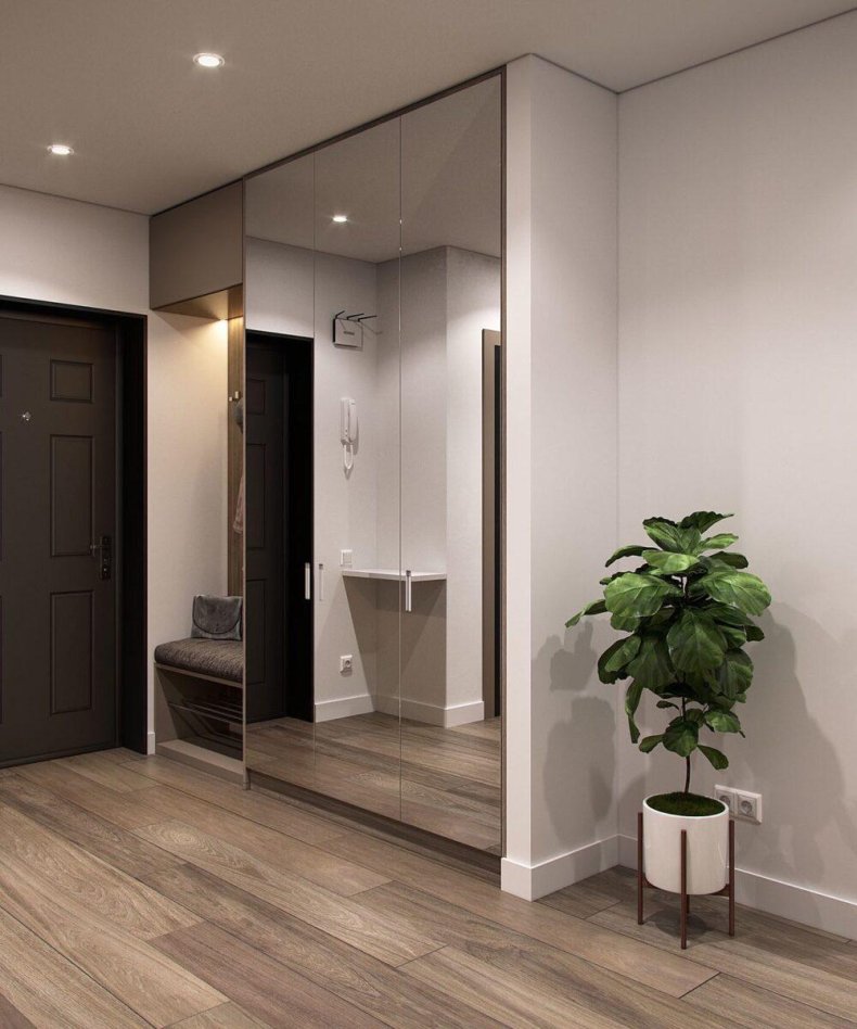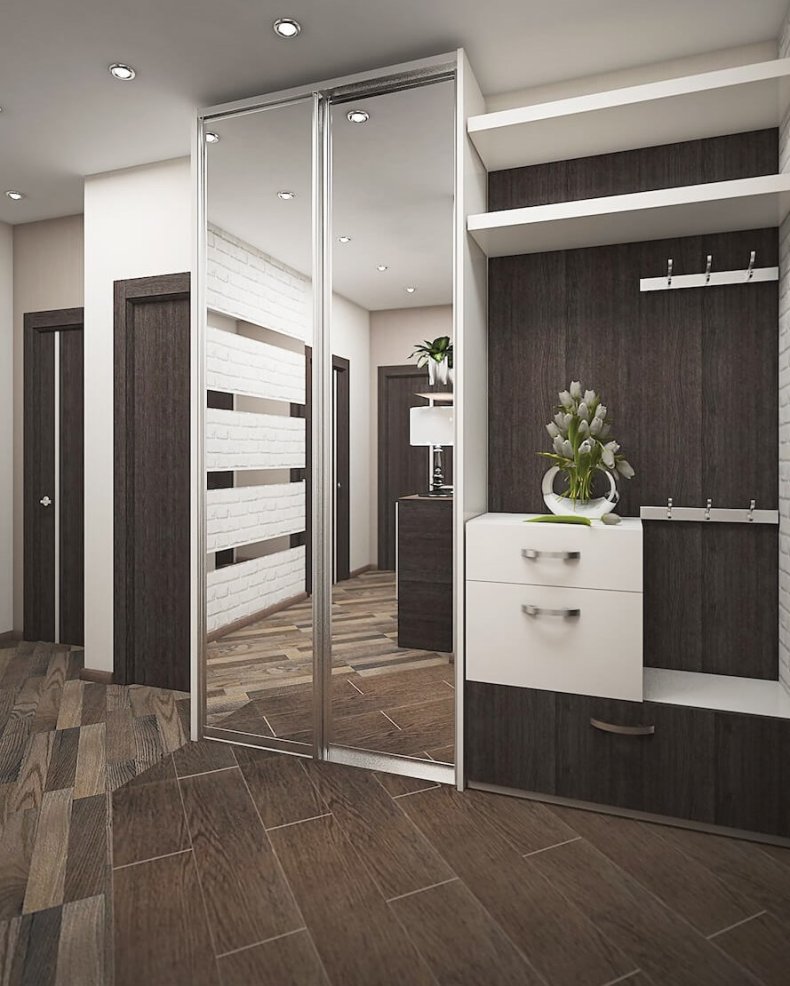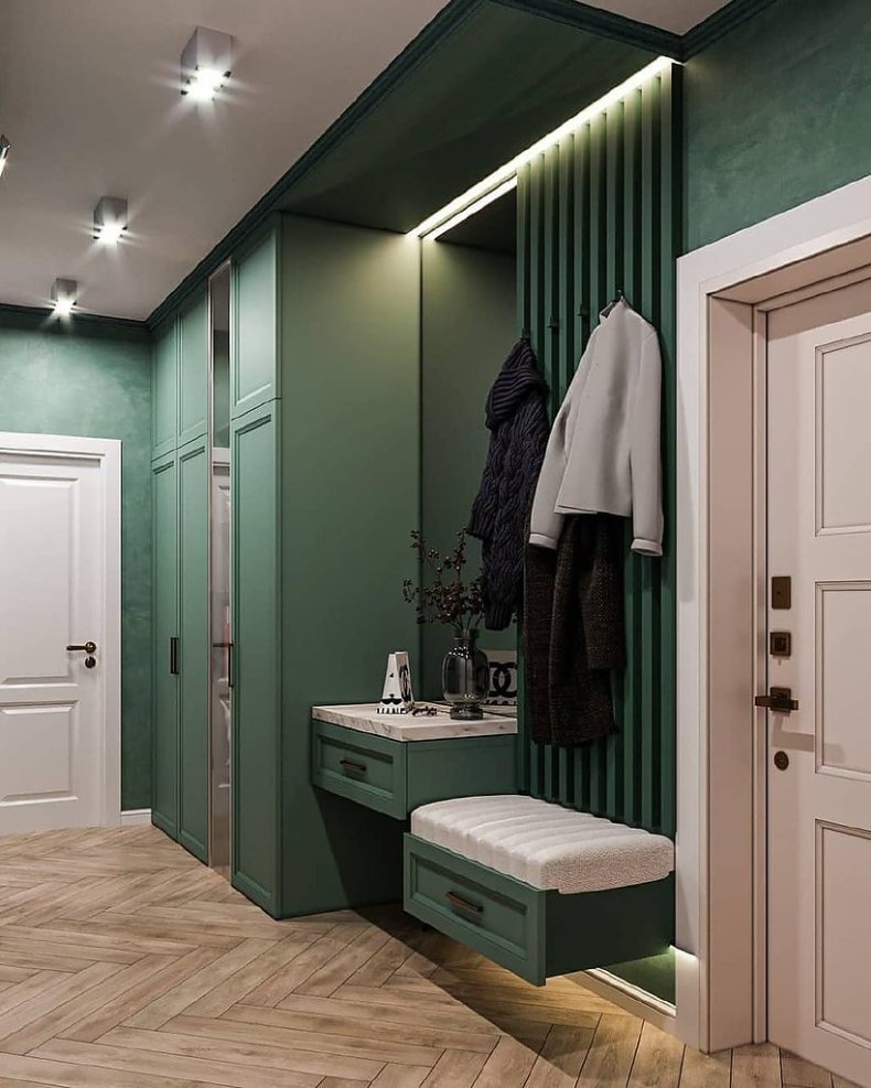 Если площади прихожей будет достаточно, установите здесь шкаф-купе, небольшой комод, а также полочки на стенах.