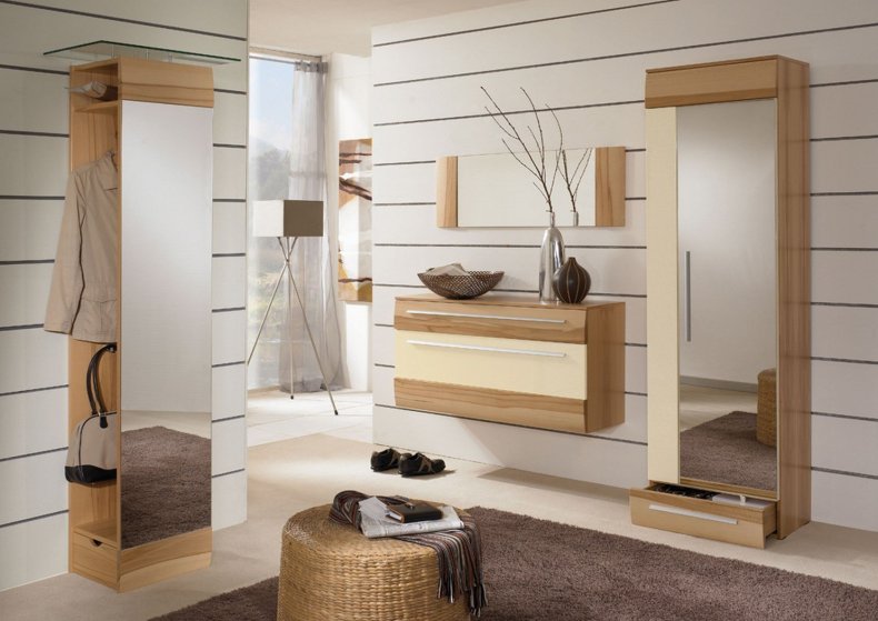 Грамотнее всего в таком случае воспользоваться пуфиками и крупными обувницами. Они идеально выполняют обе функции. Рядом можно разместить мебель, куда можно складывать одежду, а также зеркало.
