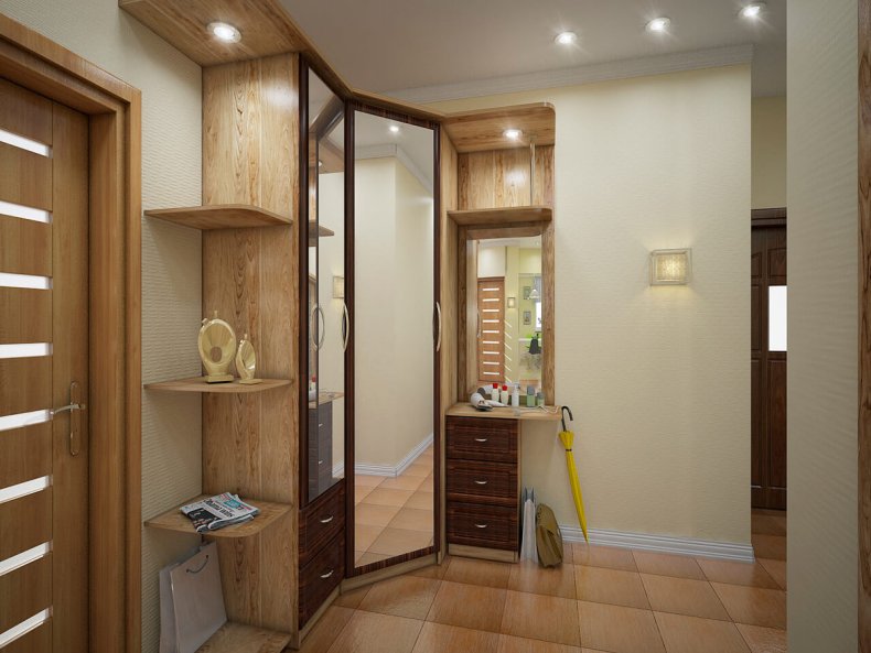 - В квартирах с хорошей планировкой и крупной прихожей, как правило, имеется ниша. Сюда можно разместить подходящий по размеру гардеробный шкаф.