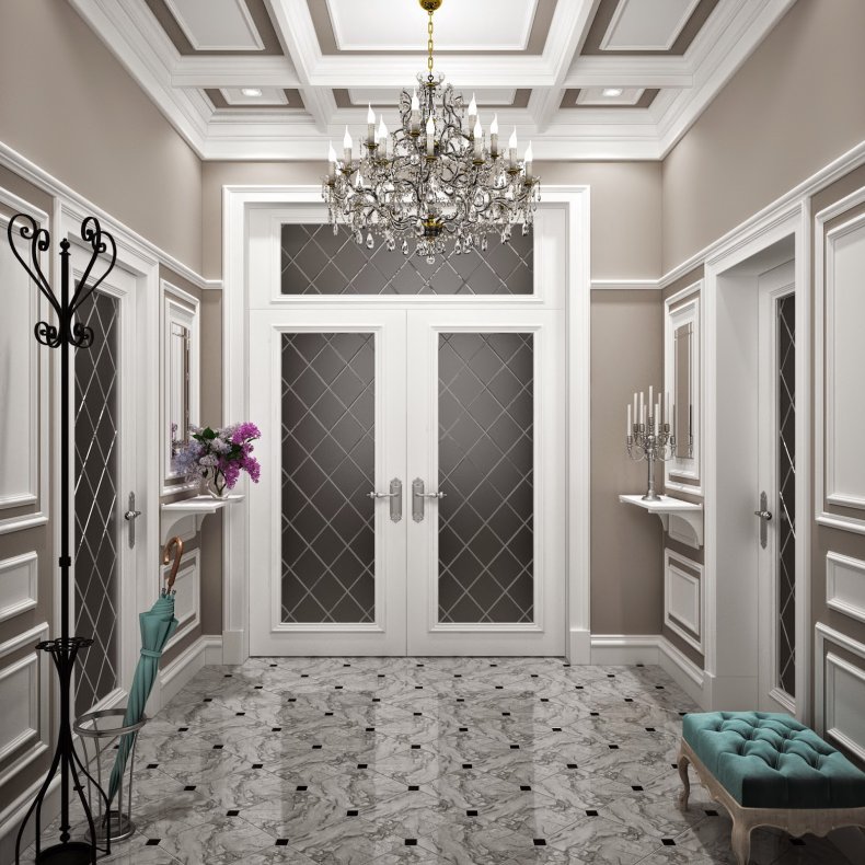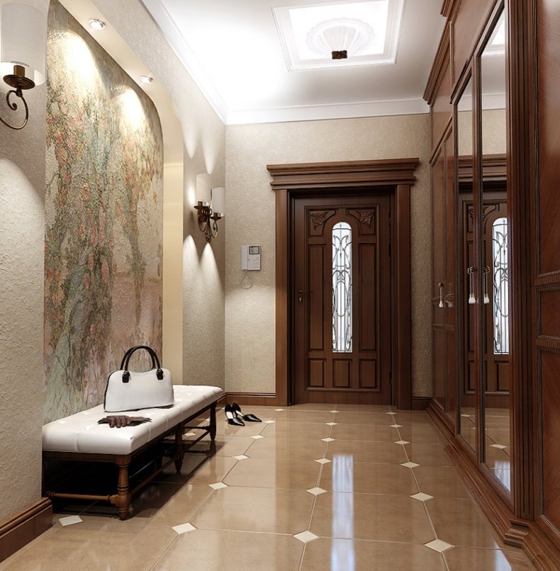 - Если прихожая выполнена в стилевом направлении неоклассика, стоит разместить на ее стенах бра.