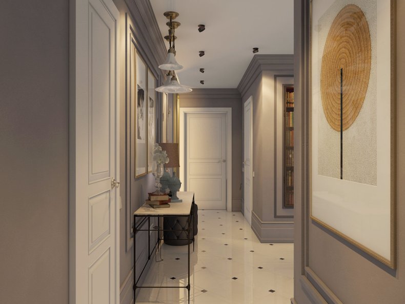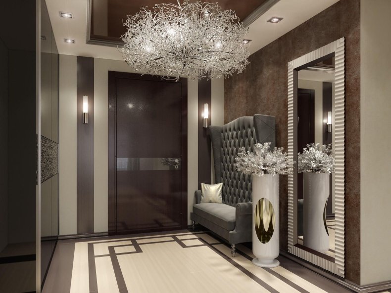 Дневной свет сюда не попадает, поэтому следует установить много искусственных его источников. Лучше всего впишутся люстры, расположенный пропорционально площади комнаты.