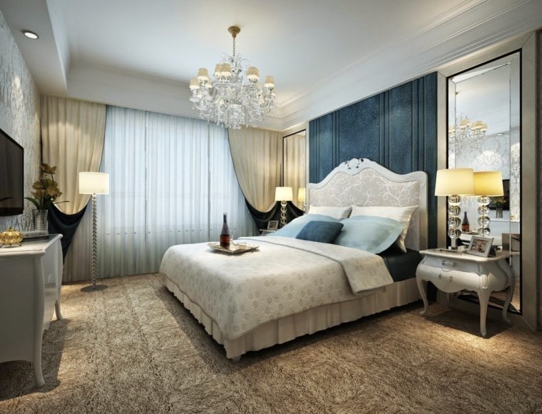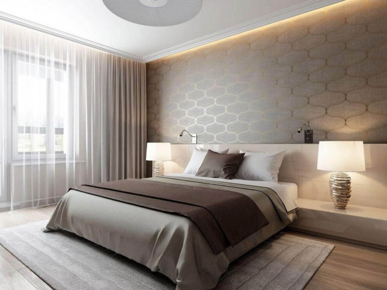 Не стоит покрывать спальню одними лишь коврами, необходимо оставлять около 1 м пространства со стеной, тем самым получится избежать ограниченного пространства.