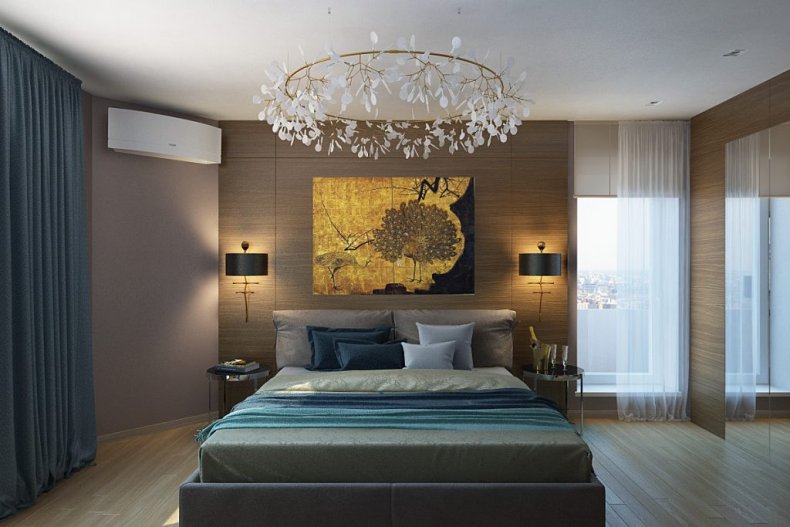 Можно вешать не только большие люстры, но и вносить в интерьер другие осветительные элементы: бра, торшеры, настольные лампы. Все это отлично подойдет для дизайна спальни в 2022 году.