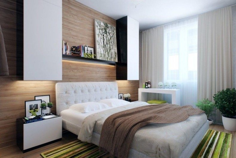 - К примеру, если не помещается прикроватная тумбочка, нужно соорудить изголовье кровати, где сверху будут находиться полочки для различных предметов.