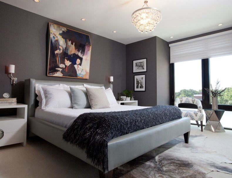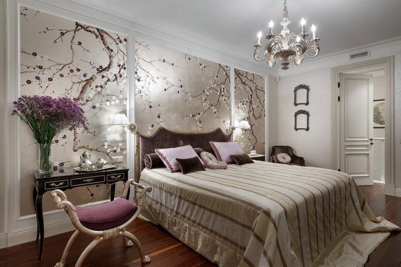 Чтобы спальня получилась в современном и одновременно элегантном стиле, в 2022 году будет пользоваться популярностью наличие картин, которые будут располагаться на любой из сторон кровати или по центру комнаты.