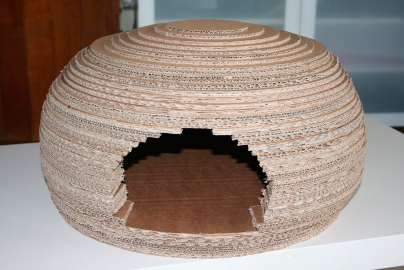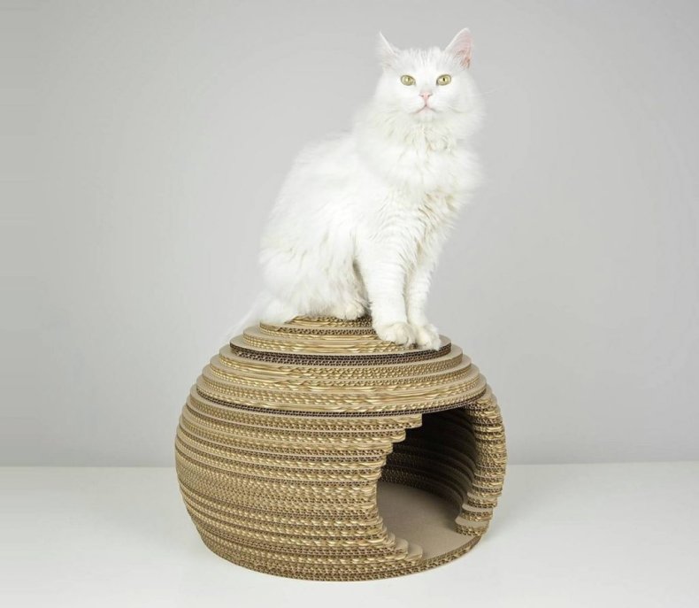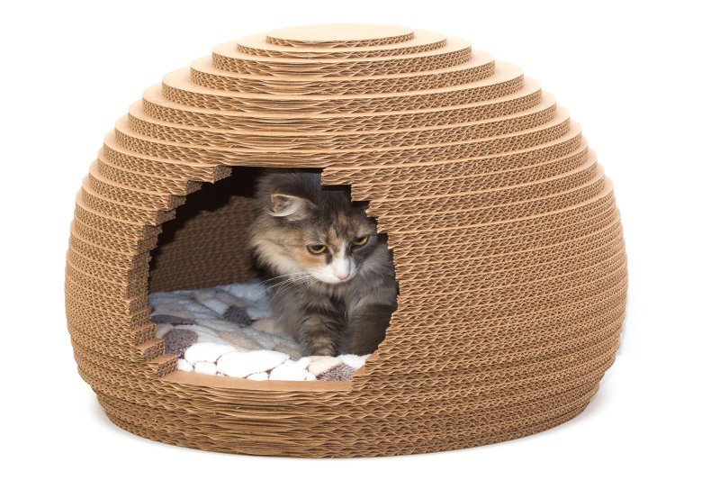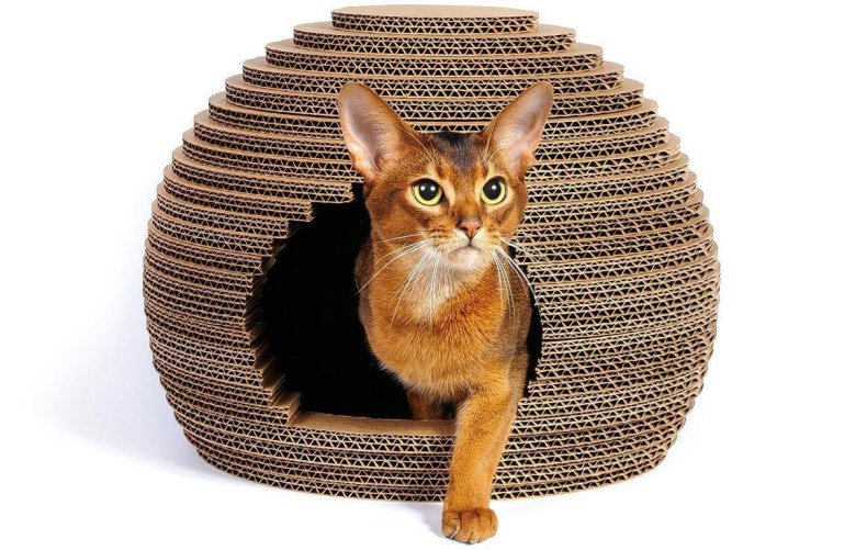 Из-за картонных рельефных линий изделие напоминает пчелиный улей. Чаще изготавливаются шарообразные домики. Об ребристый картон кошечка точит свои ногти.