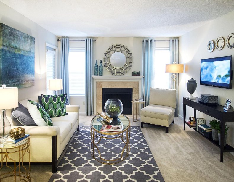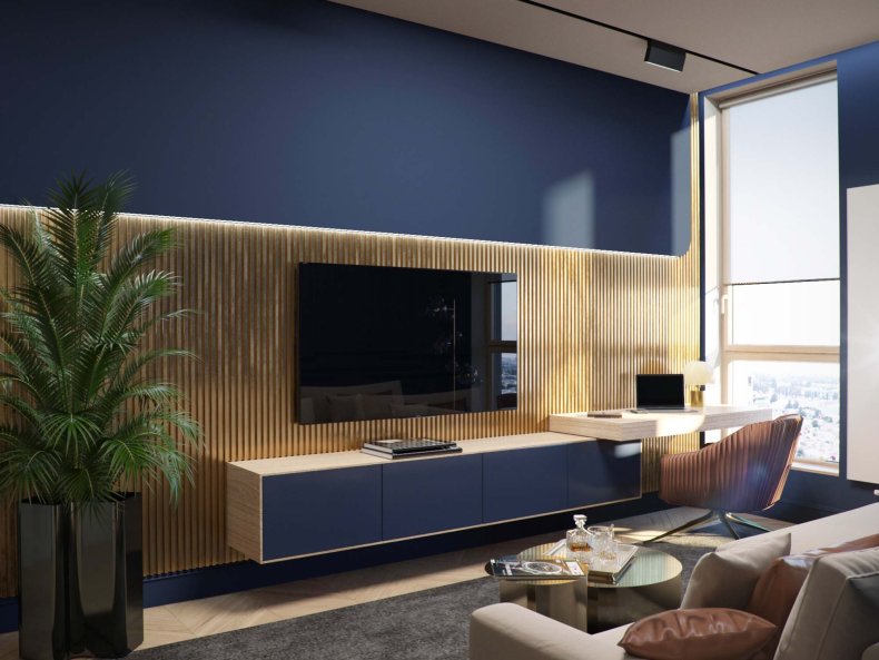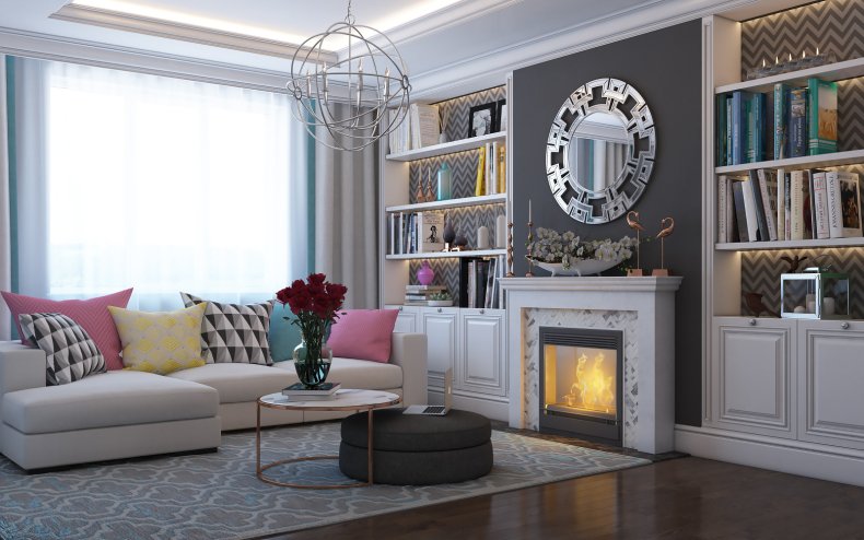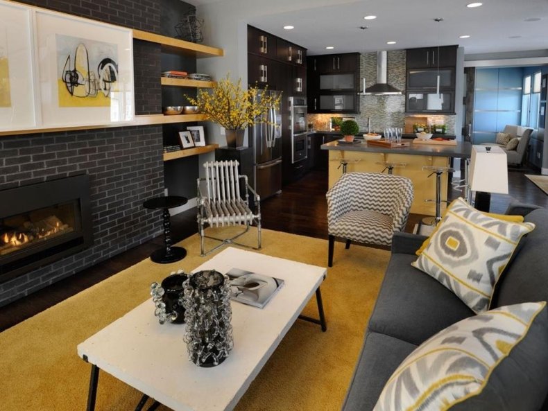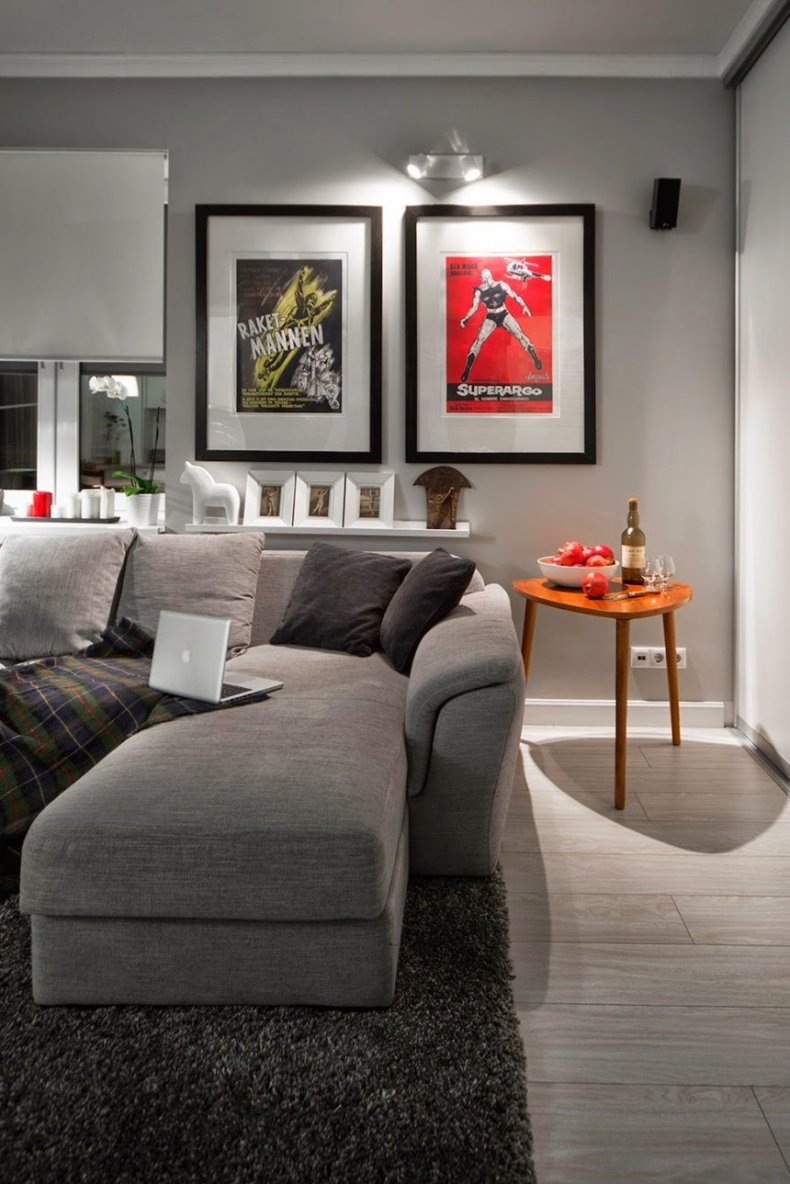 - Напротив дивана обычно ставят или вешают телевизор и камин. Из мебели также можно установить кресло и журнальный столик, они не займут много места в пространстве, но при этом создадут дополнительные площади для комфортного размещения и приема гостей.
