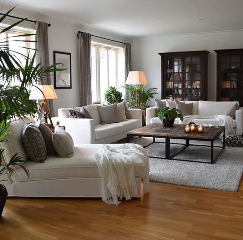 Квадратная комната позволяет централизовать композицию, мебель обычно ставят в одном месте, освобождая от нагромождения углы. Так гостиная смотрится красивее, создается чувство легкости.