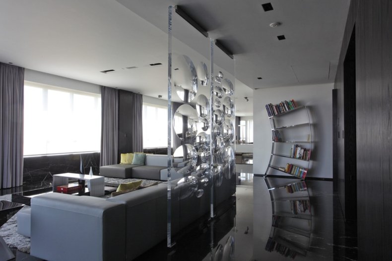 Разделение пространства поможет выделить несколько функциональных зон в гостиной. Например, можно разделить помещение на место для отдыха и зону для приема гостей, возможно, кто-то захочет обустроить в гостиной даже небольшой кабинет для работы.