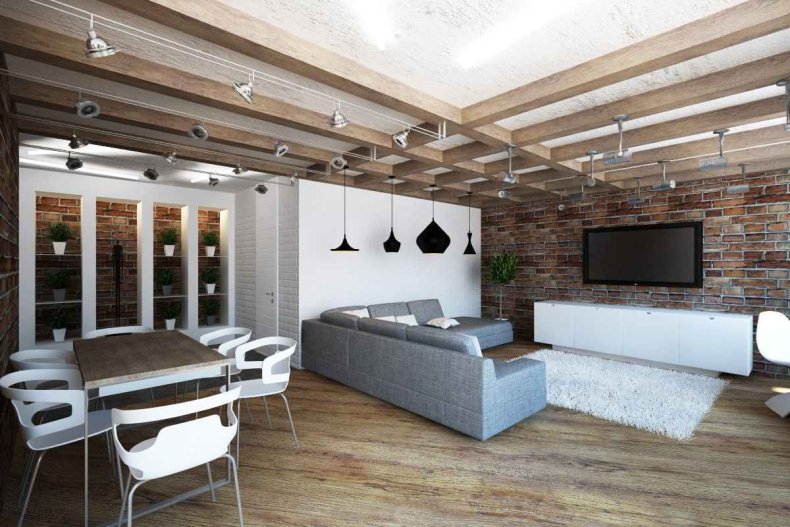 Лофт тоже лаконично украсит пространство, к тому же обойдется в отделке он дешевле, чем предыдущие два стиля. Одну стену можно сделать просто кирпичной, это будет одновременно и привлекать внимание, и сразу акцентировать его на то, какой именно стиль использовался в пространстве.