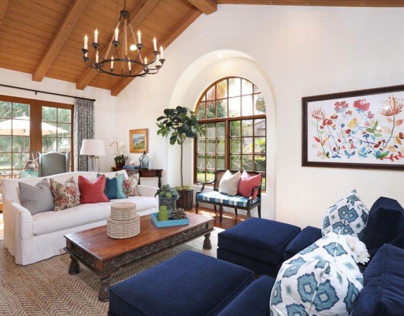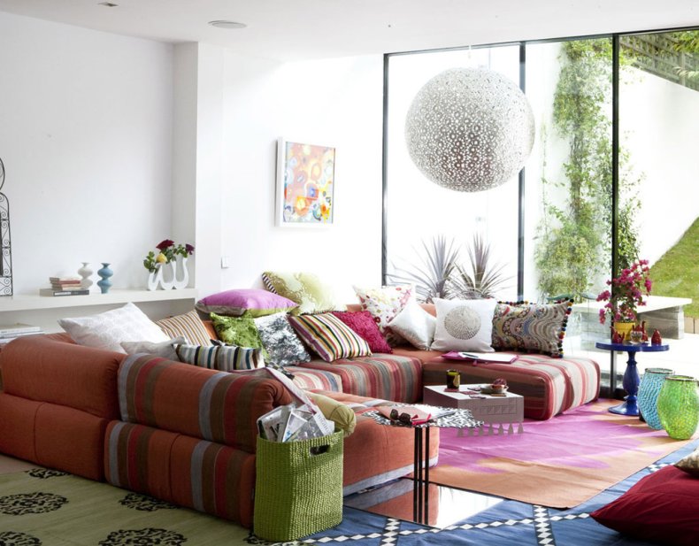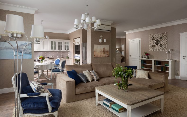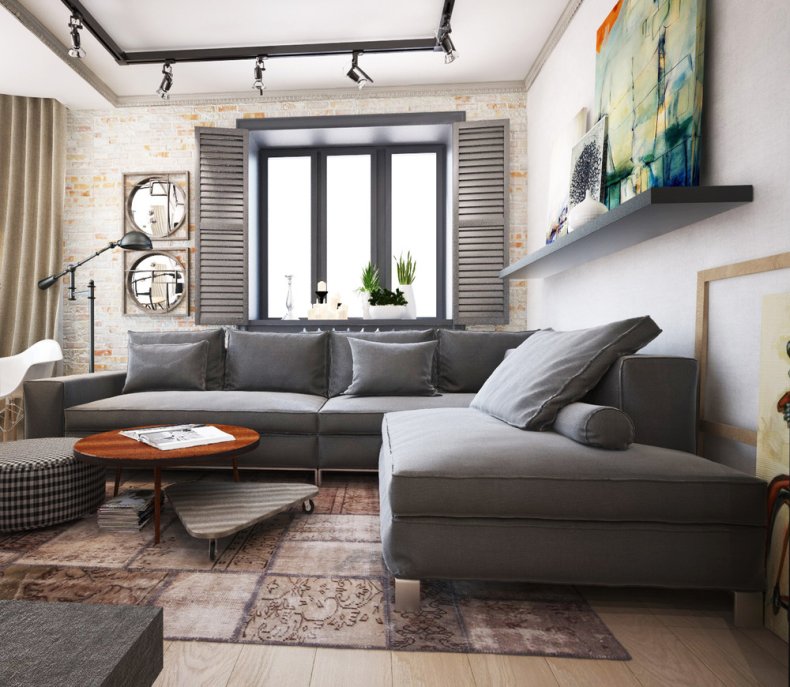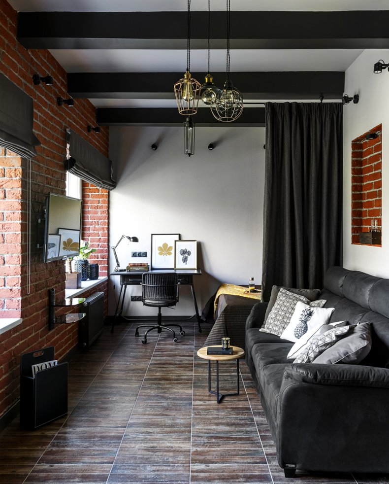 Хорошо впишется в такое пространство угловой диван или раскладная кровать. Они помогут разместить необходимое количество гостей, при этом пространство будет использовано рационально.
