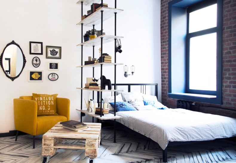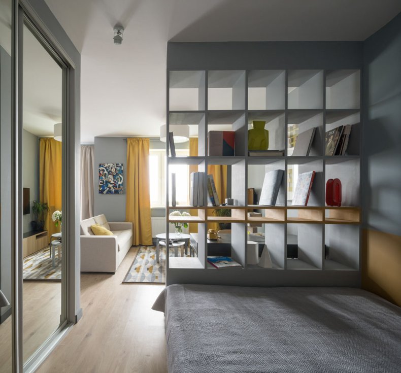 - Если вам нужно разделить пространство без ущерба к нему, то используйте стеллаж. Сейчас продается много разных конструкций, которые подходят под любое помещение. Он отлично пропускает свет и не загромождает комнату;