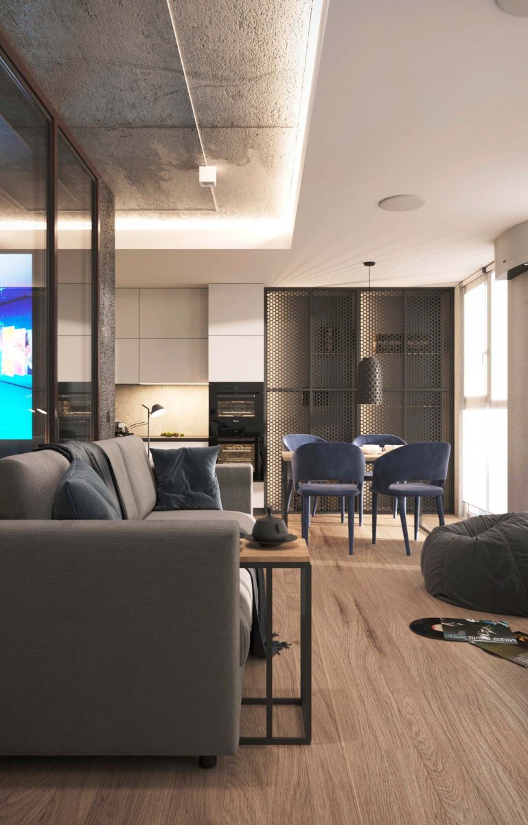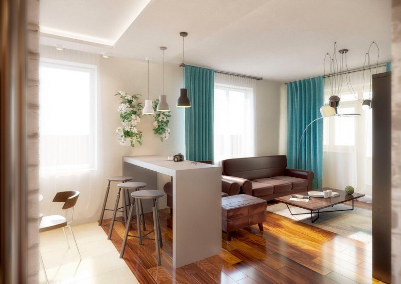 Если балкона нет, то перепланировки можно добиться путем зонирования. Здесь не потребуется ничего сносить и утеплять, игра разных материалов в одном помещении поможет разграничить гостиную и даже визуально увеличить ее размеры.