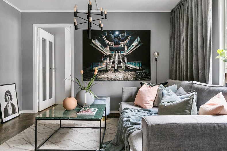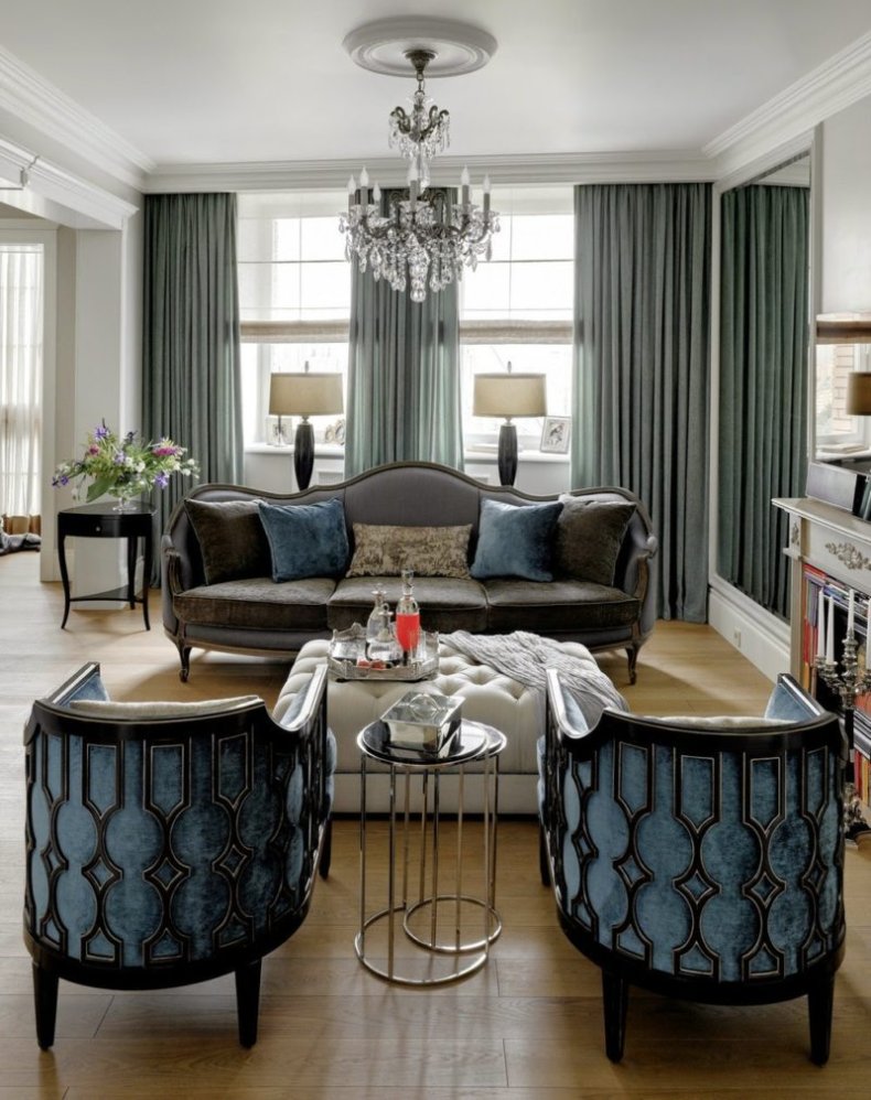 - Если освещения будет хватать, то гостиную можно выполнить в приглушенных оттенках, например, сером, охре, оливковом цвете.