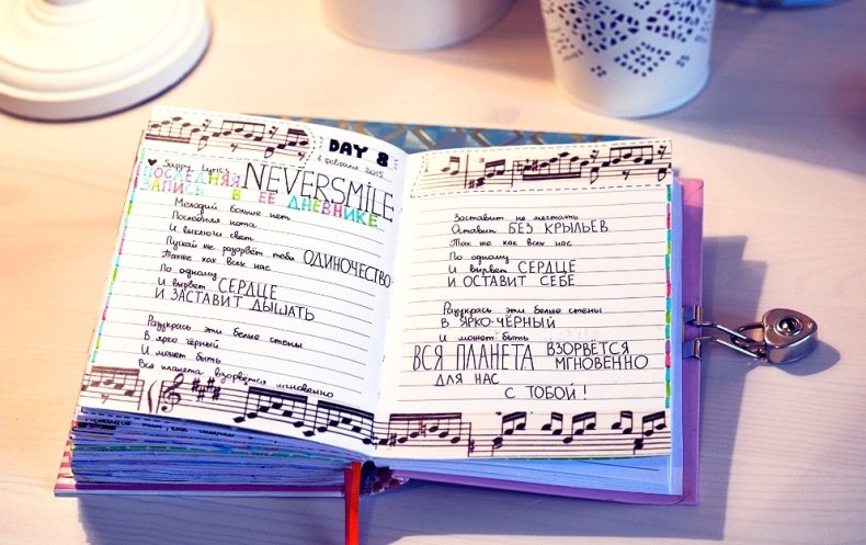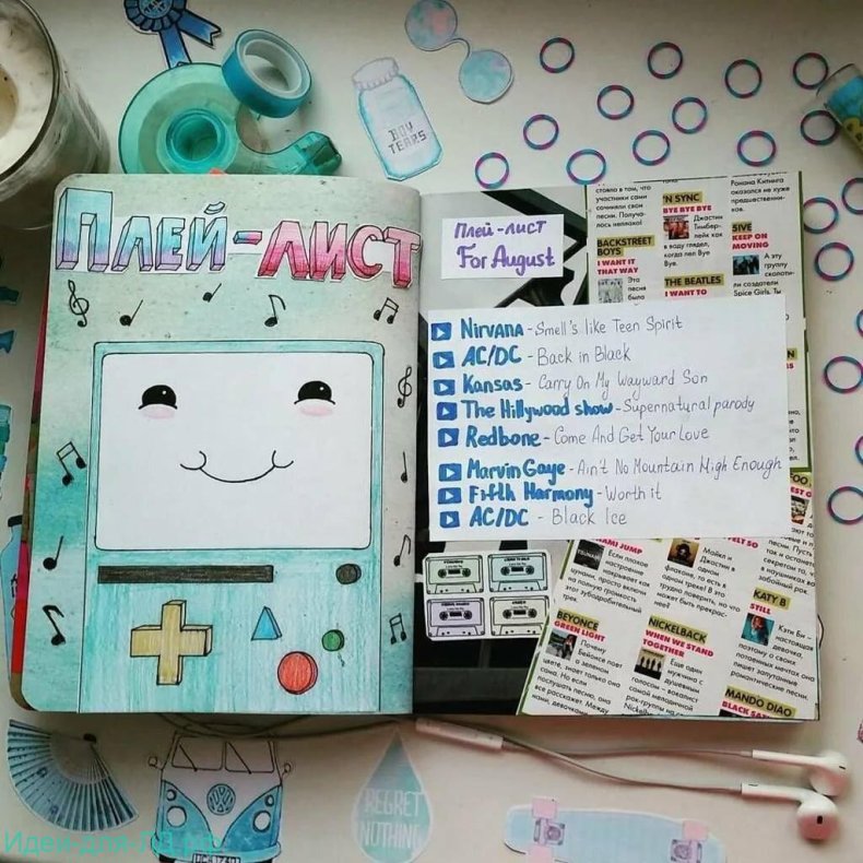Если вы любите музыку и частенько ее слушаете можно составить плейлист прям на одном из разворотов своего дневника. Для начала формируется список самых любимых песен, можно даже классифицировать их по настроению: плейлист для вечеринок, плейлист для спорта, плейлист для прогулок в сумерках.