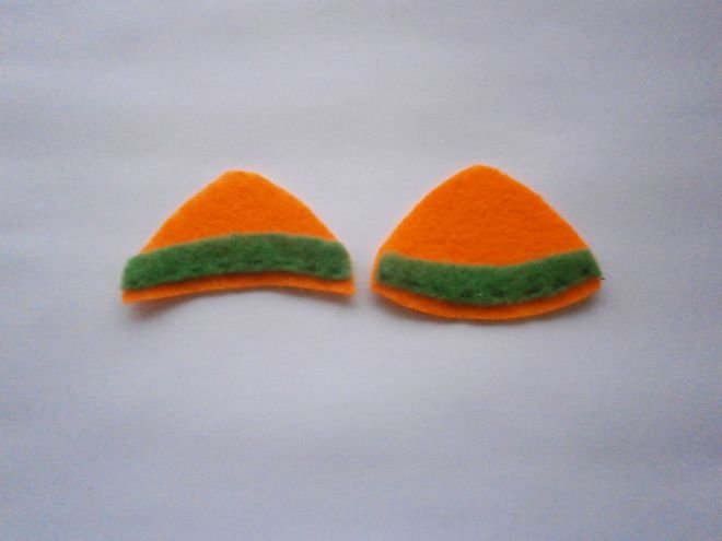 - Из бежевого фетра создаются в парах мордочка, внутренняя часть ушек, рожки, также соединяются друг с другом.