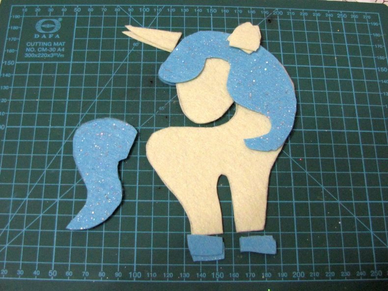 - Из материала любого цвета вырезается волнистый хвостик и грива единорога, сшиваются аккуратными и маленькими стежками.