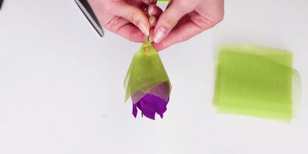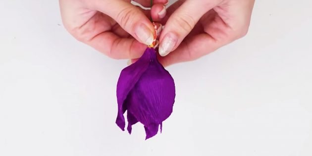 - Свяжите снизу ниткой или тонкой проволокой. Готовую заготовку прикрепите к стебельку.