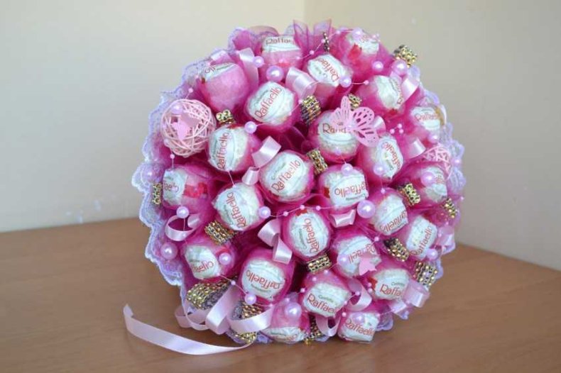 - Конфеты в обёртке. С ними легко работать. Подойдут любые шоколадные конфеты. Конфеты в фантиках из фольги сами по себе смотрятся красиво. Для создания букетов отлично подходят Раффаэлло, Ферреро, трюфеля, конфеты из наборов ассорти, завёрнутые в блестящую обёртку. Выбор за автором. В сладких букетах для детей используют леденцы на палочках, киндер сюрпризы, маленькие шоколадки.